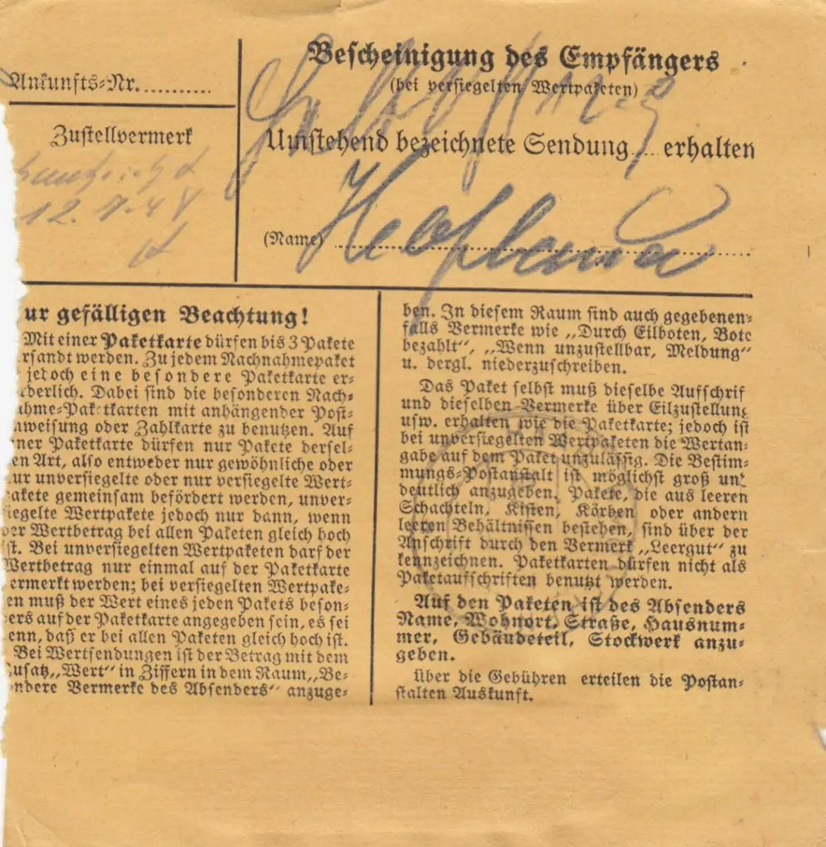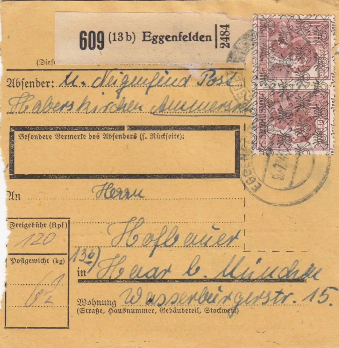 Carte de paquet BiZone 1948: Eggenfelden Post Haberskirchen après Haar