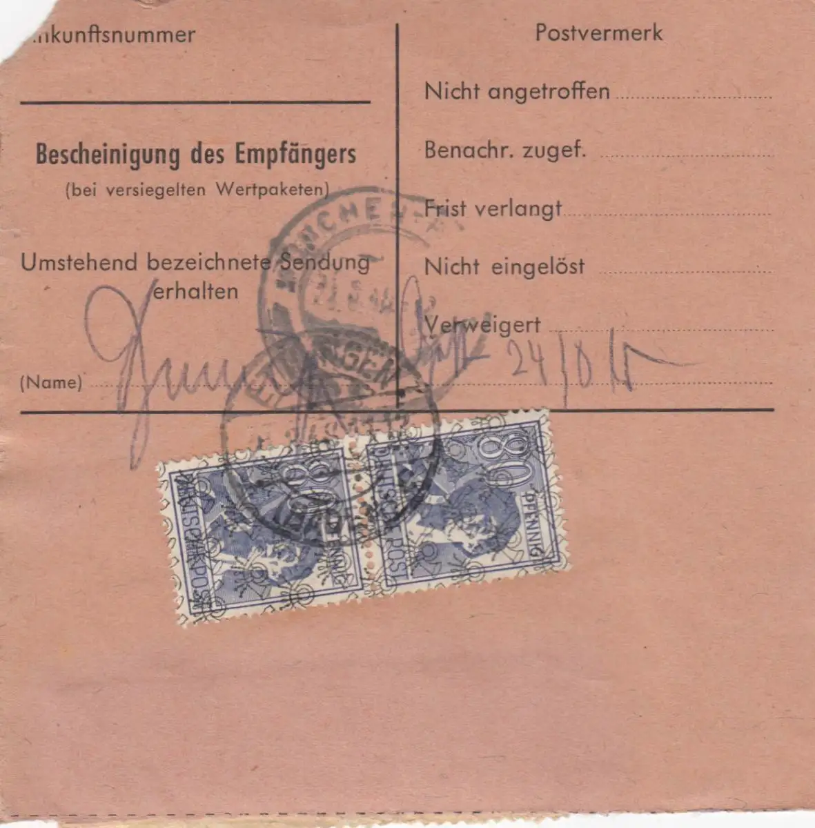 Carte de paquet BiZone 1948: Ettlingen après Gräfelfing, Achat, Jeker OHG