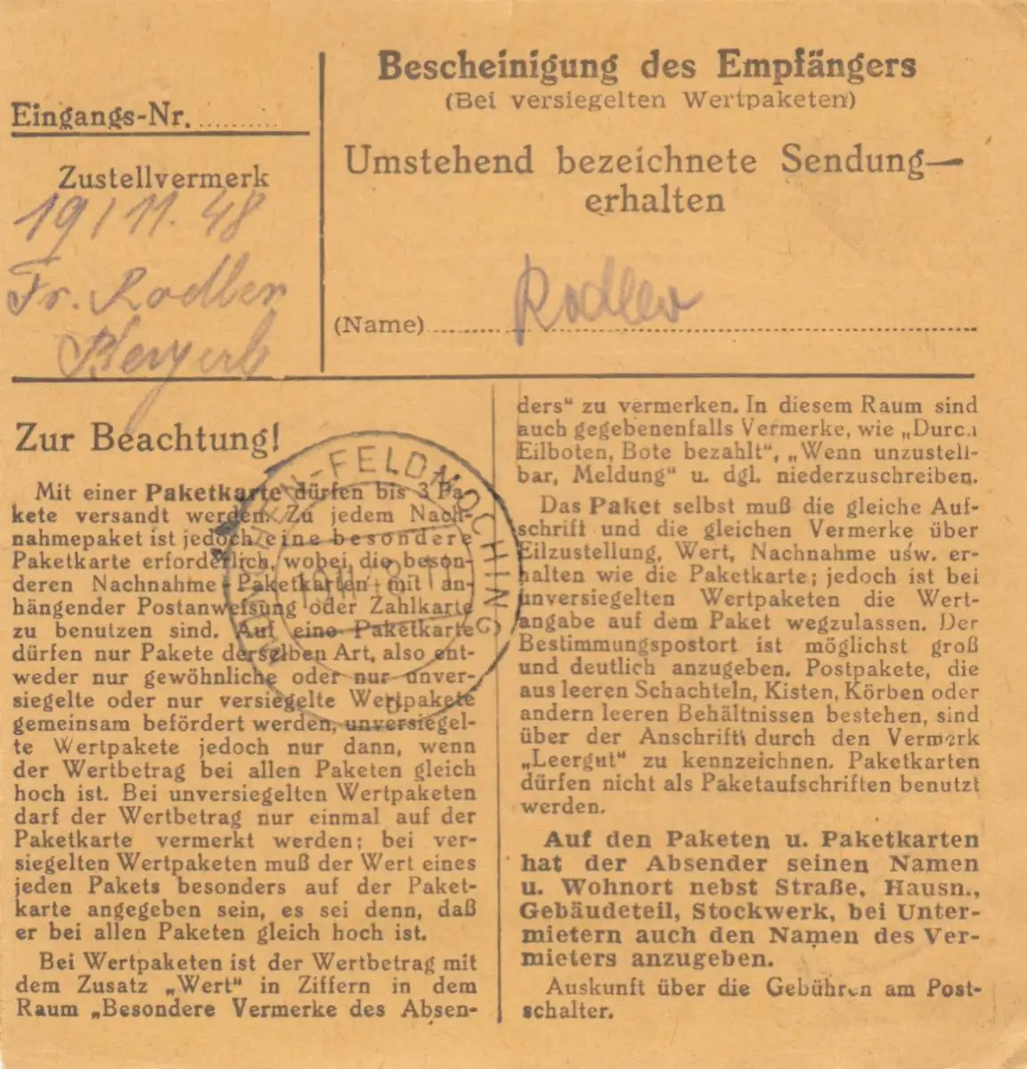 Carte de paquet BiZone 1948: Falkenfels par Feldmoching, frais supplémentaires