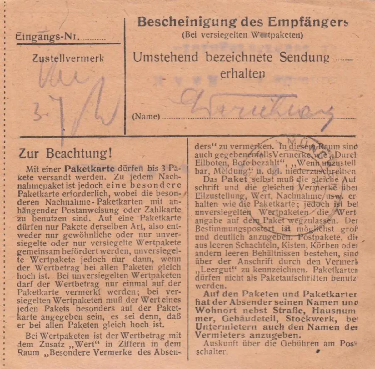 Carte de paquet BiZone 1948: Feilnbach, Nordmann KG - articles en cuir -, selon les cheveux
