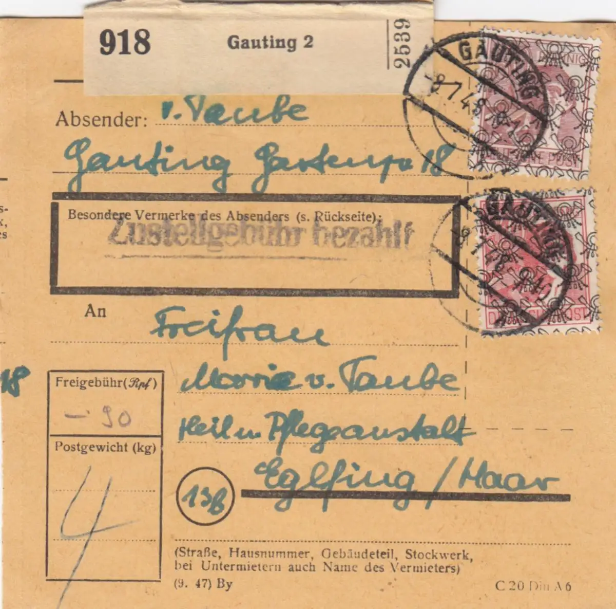 Carte de paquet BiZone 1948: Gauting 2 après Eglfing, établissement de soins