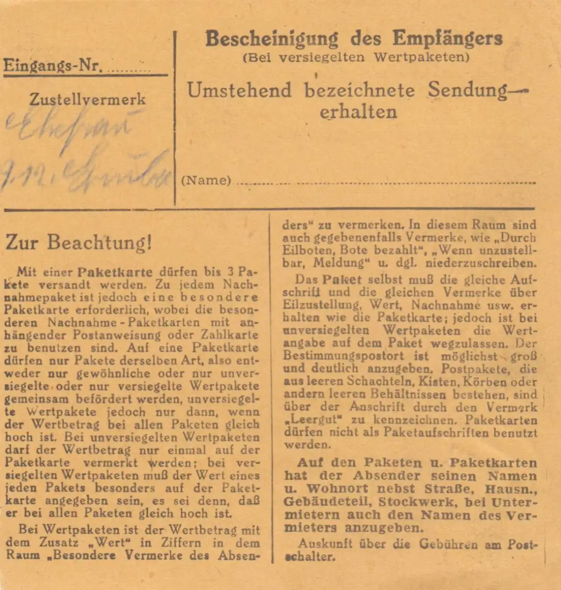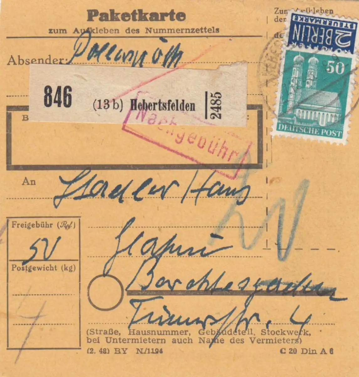 Carte de paquet BiZone 1948: Herbertsfelden vers Berchtesgaden, supplément