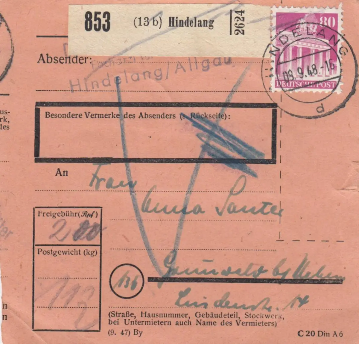 Carte de paquet BiZone 1948: Hindelang vers Grünwald