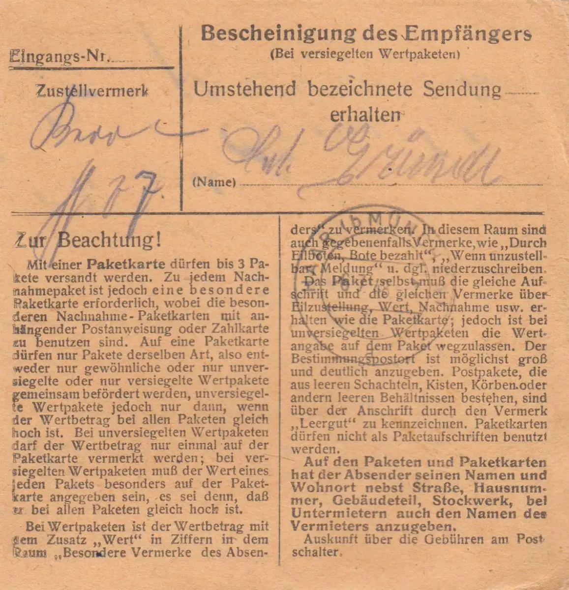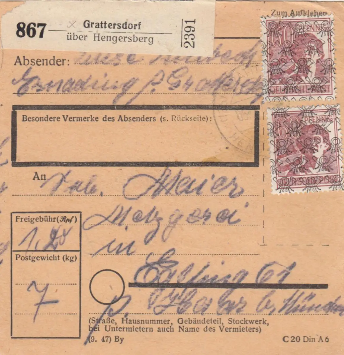 Carte de paquet BiZone 1948: Ismaning Post Grattersdorf vers Eglfing