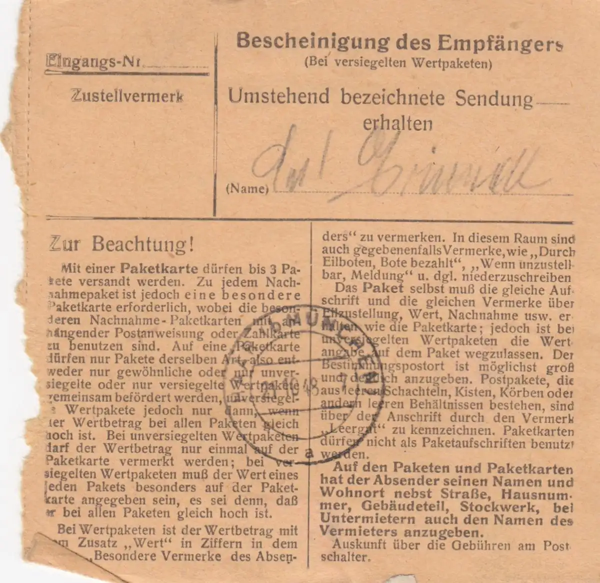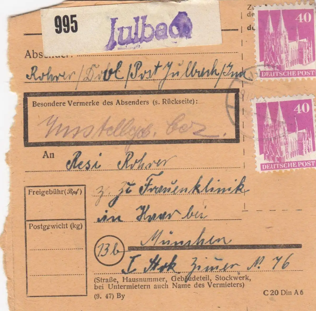 Carte de paquet BiZone 1948: Julbach après les cheveux, clinique pour femmes