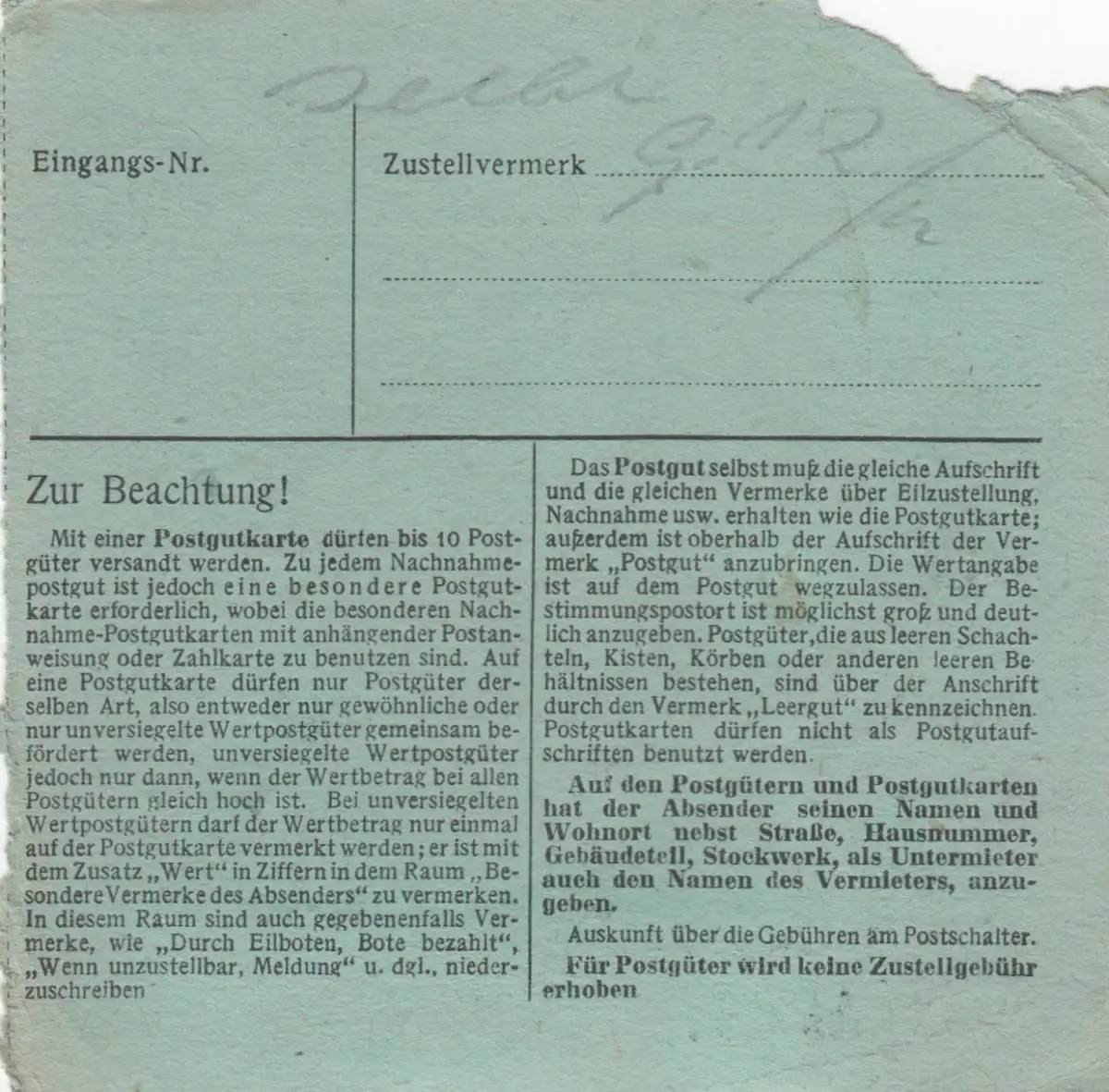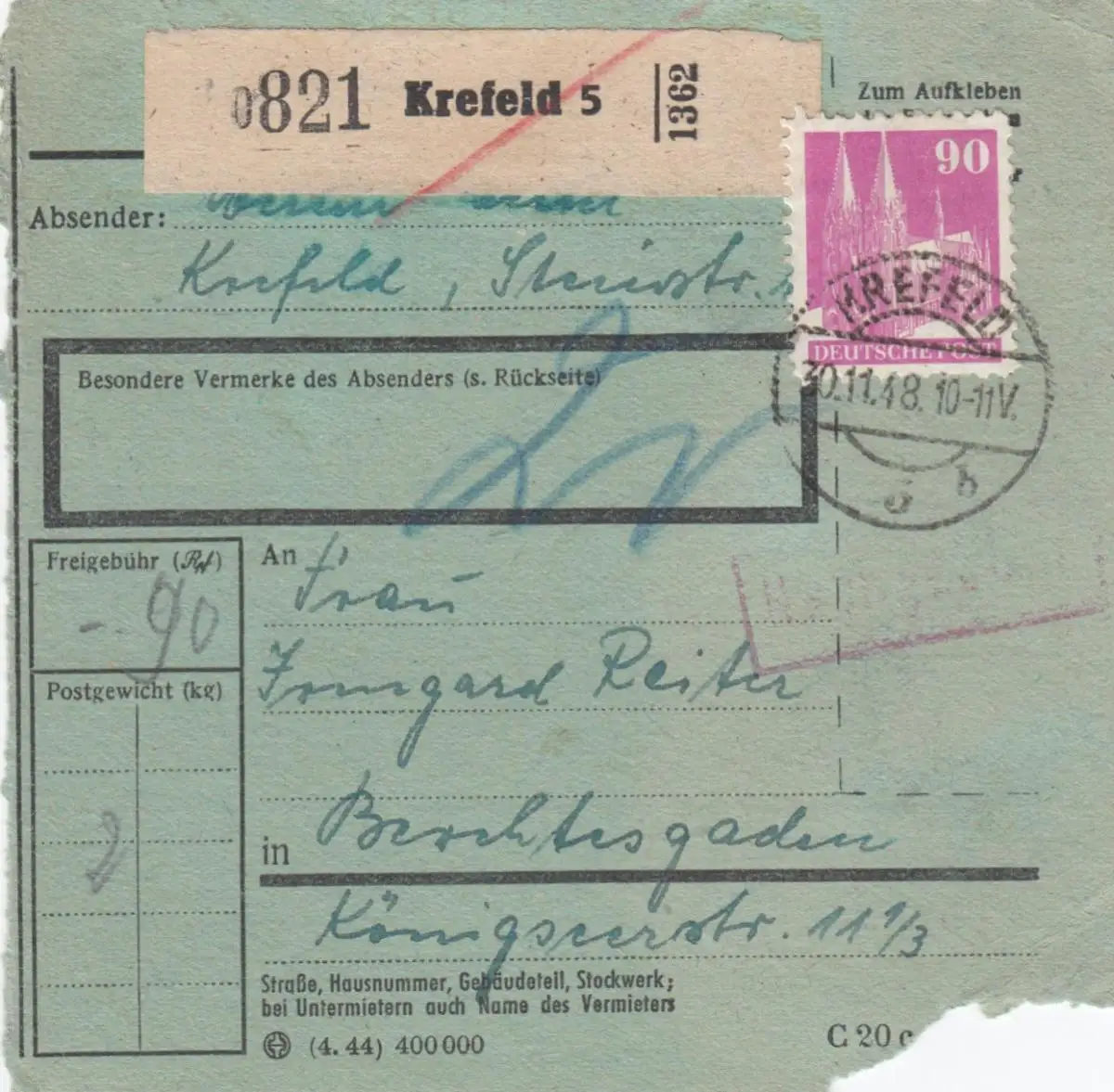 Carte de paquet BiZone 1948: Krefeld selon Berchtesgaden, supplément, forme spéciale.