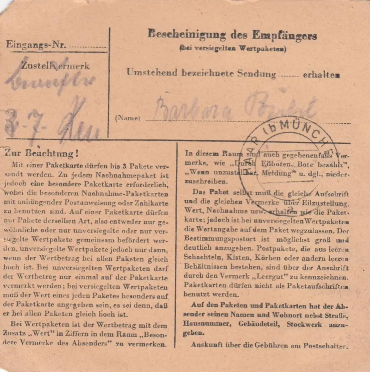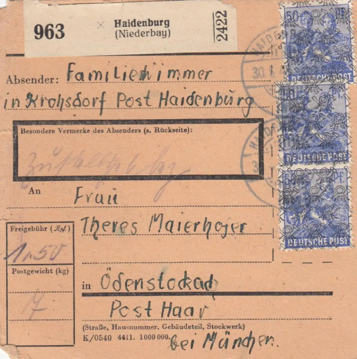 Carte de paquet BiZone 1948: Krohsdorf Post Haidenburg vers Ödenstockach