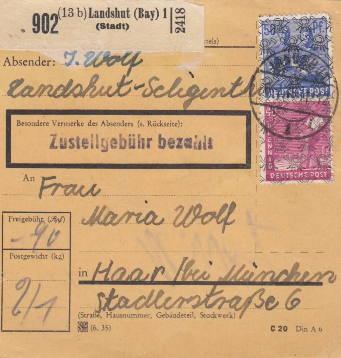 Carte de paquet BiZone 1948: Landshut Schligenthal après cheveux