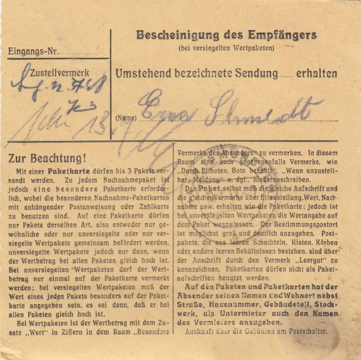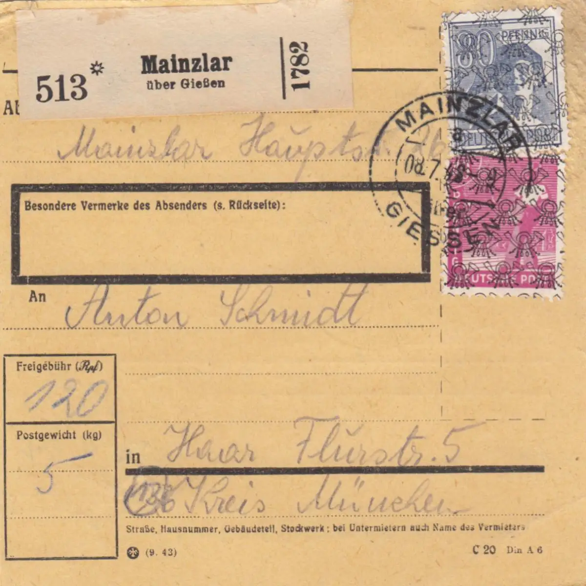 Carte de paquet BiZone 1948: Mainzlar après Haar Kreis Munich