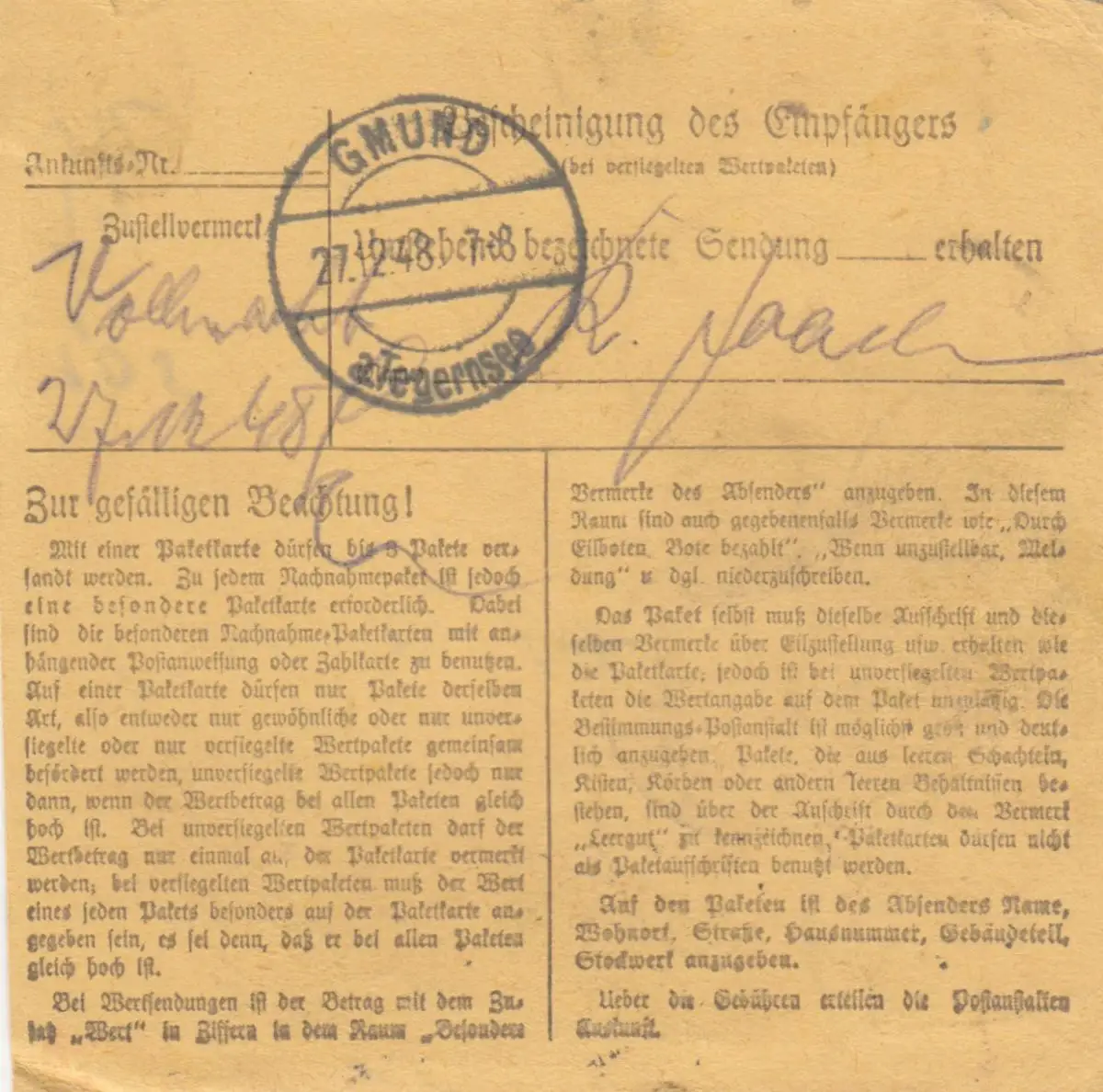 Carte de paquet BiZone 1948: Mannheim Waldhof à Gmund, victime d'urgence