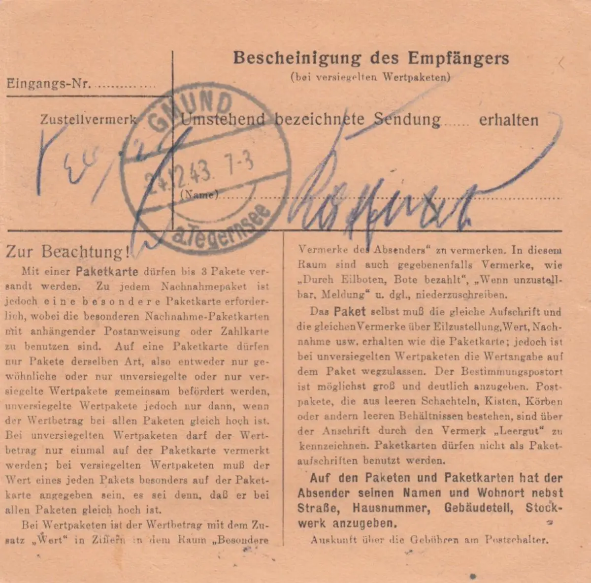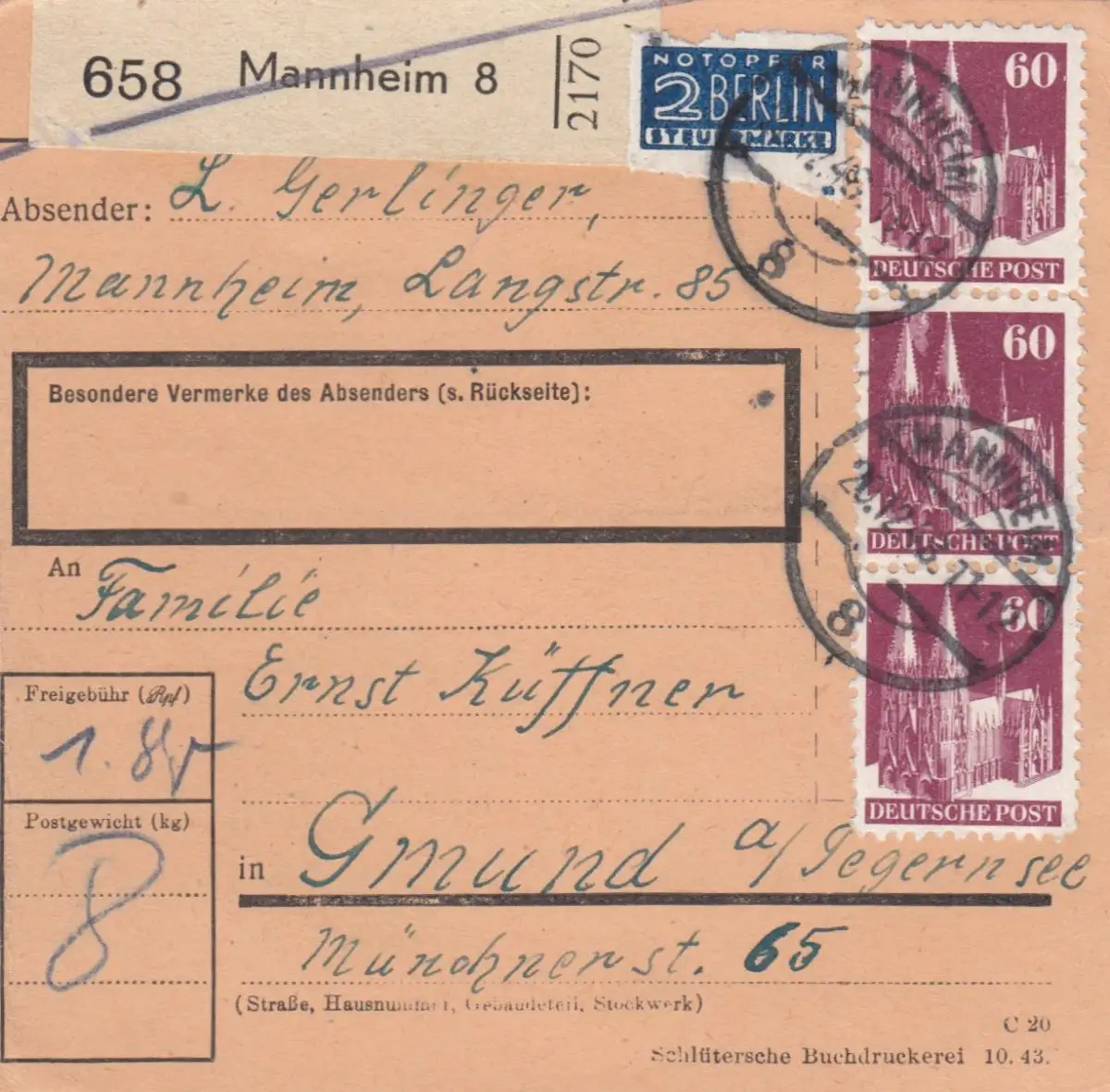 Carte de paquet BiZone 1948: Mannheim à Gmund am Tegernsee, Victimes d'urgence