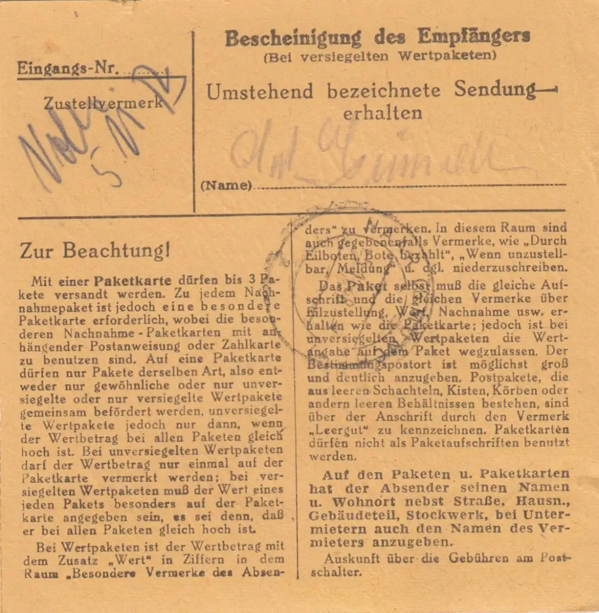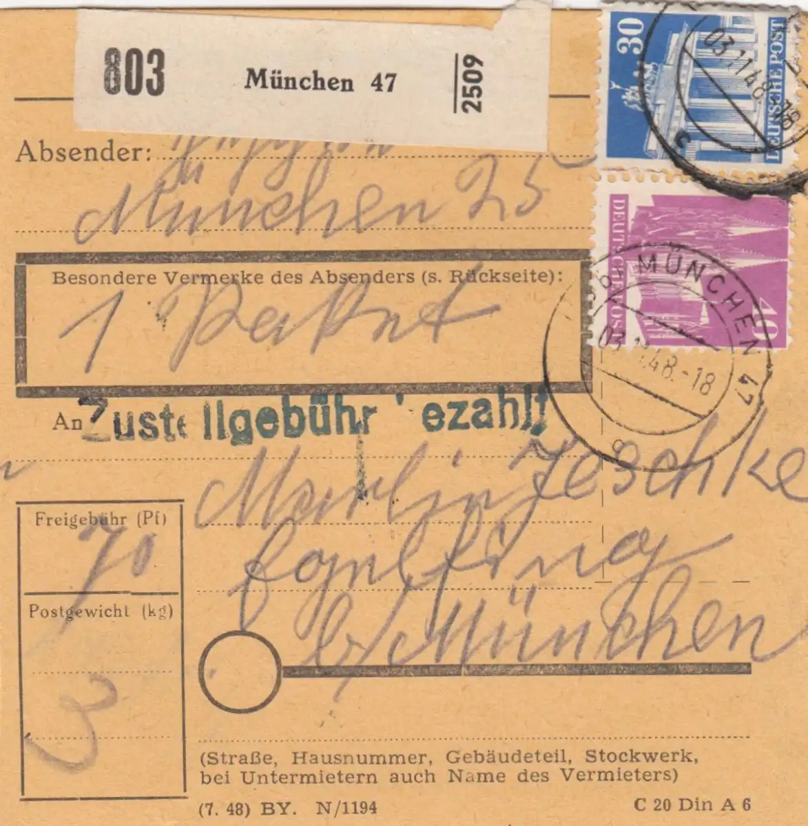 Carte de paquet BiZone 1948: Munich 47 vers Eglfing b. Munich