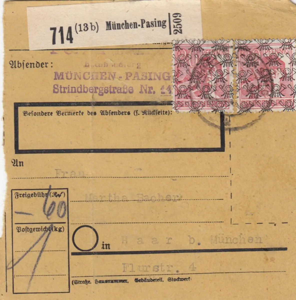 Carte de paquet BiZone 1948: Munich-Pasing après les cheveux
