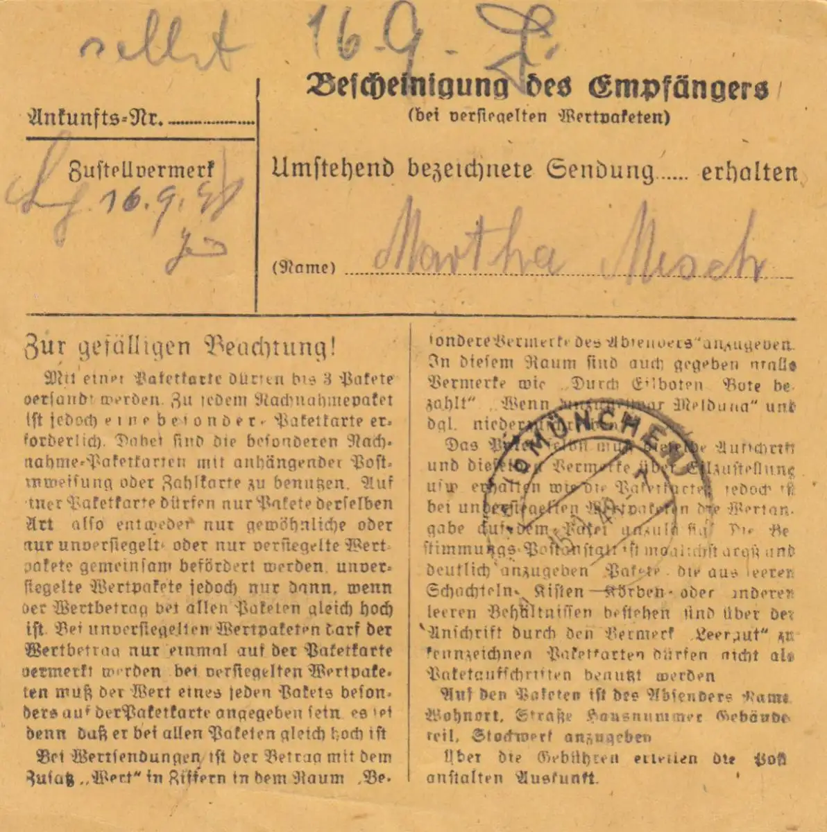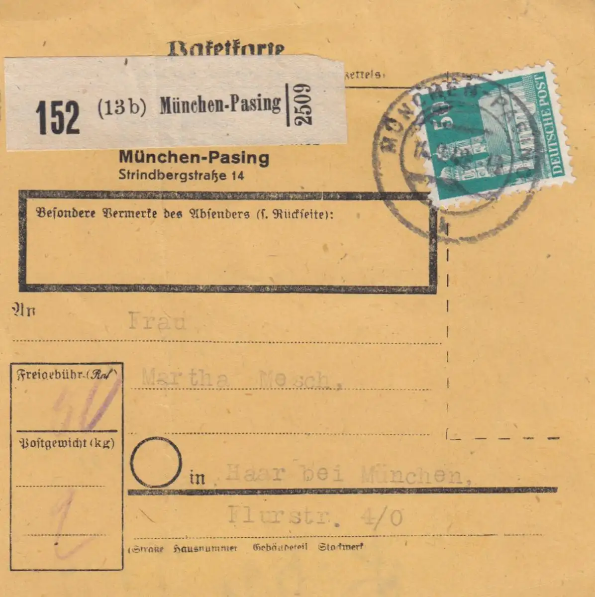 Carte de paquet BiZone 1948: Munich après Haar, carte auto-réservation avec valeur