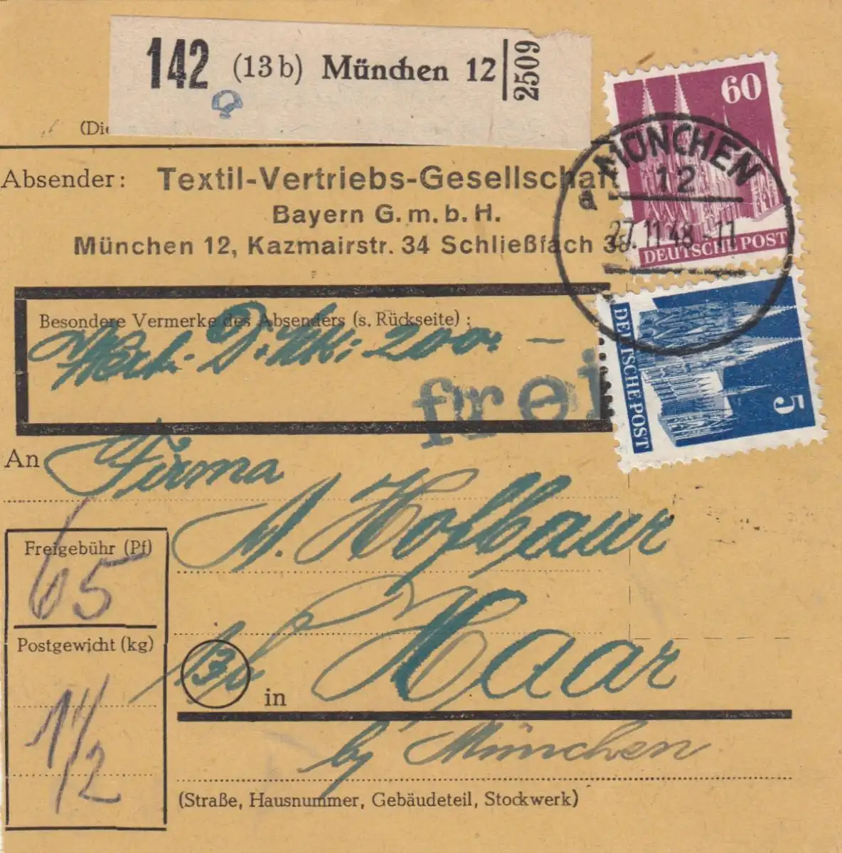 Carte de paquet BiZone 1948: Munich après Haar, carte auto-réservation avec valeur