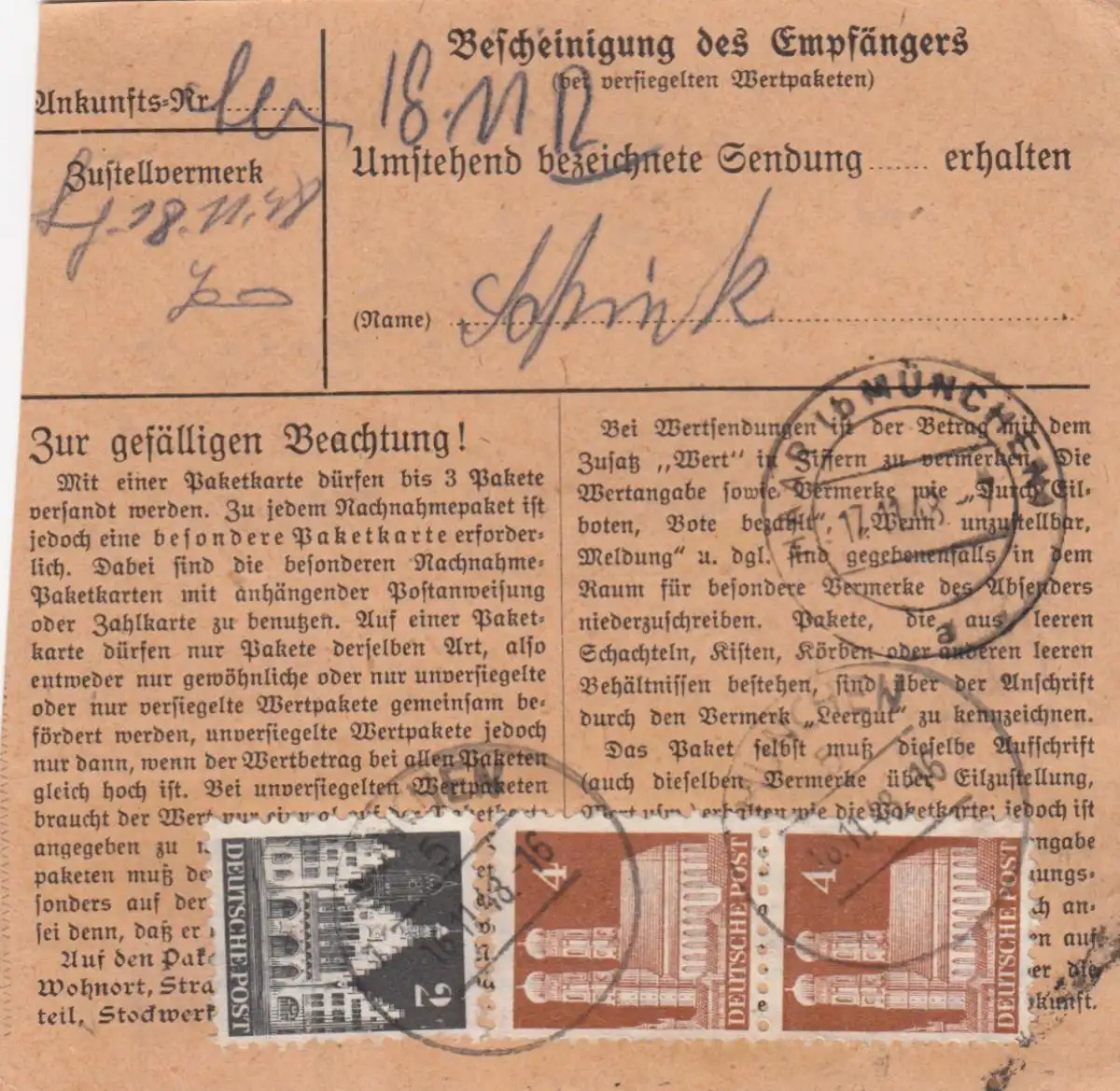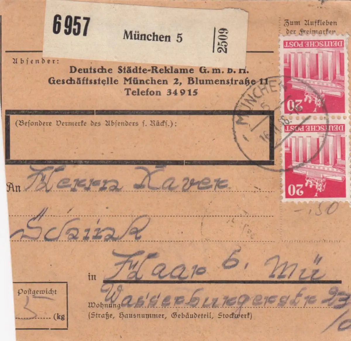 BiZone Carte de paquet 1948: Munich après Haar b. Munich, carte de livreur automatique