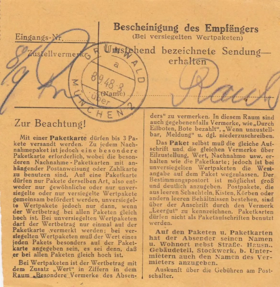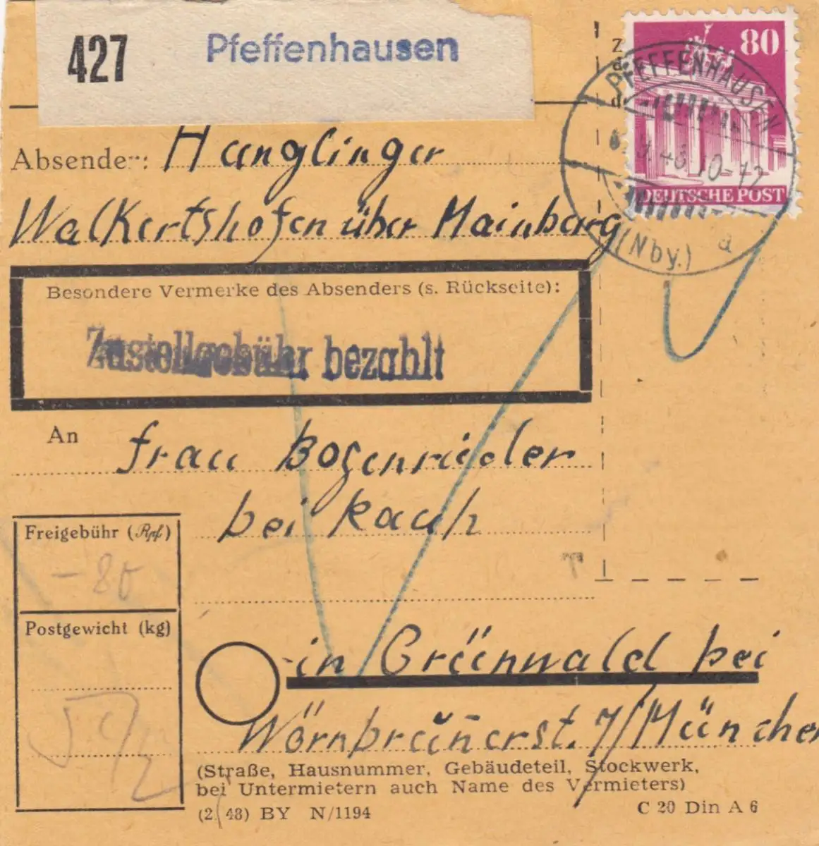 Carte de paquet BiZone 1948: Pfeffenhausen vers Grünwald