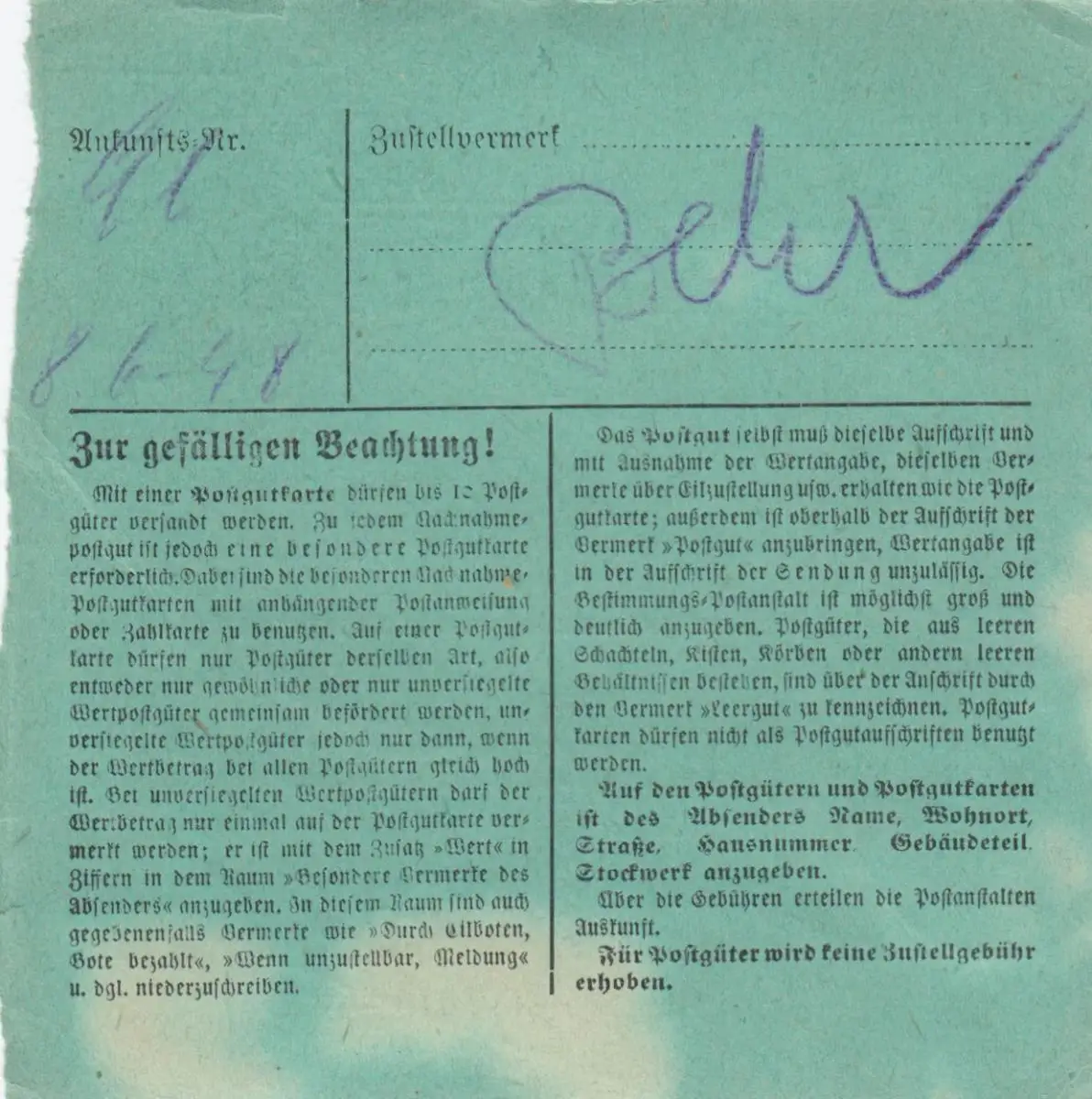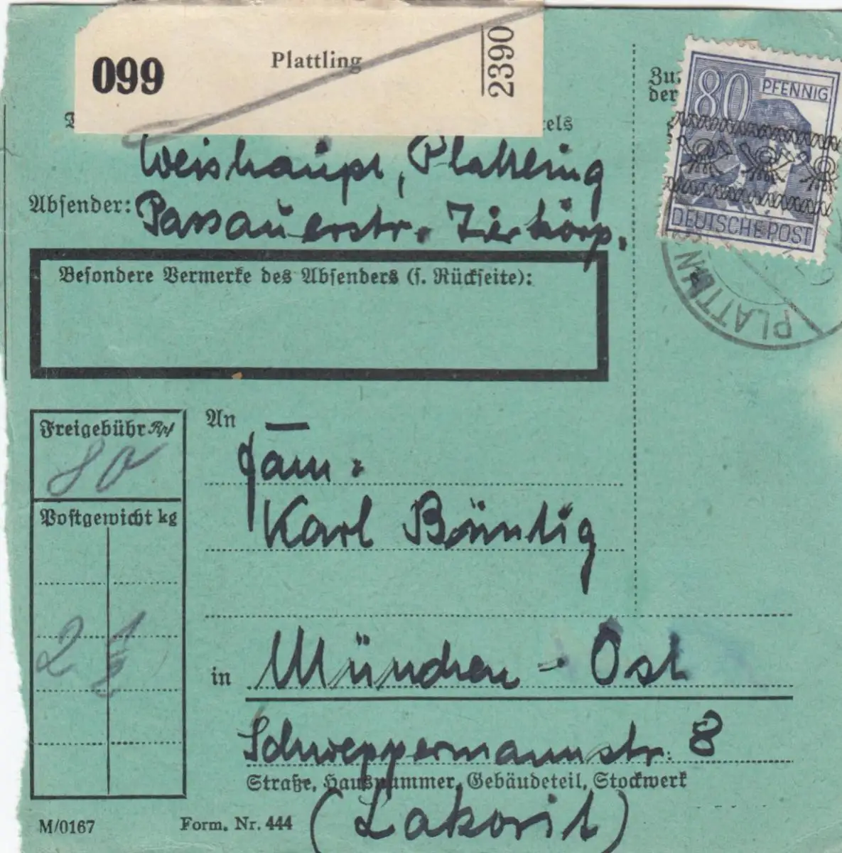 Carte de paquet BiZone 1948: Plattling vers Munich-Est, formulaire spécial