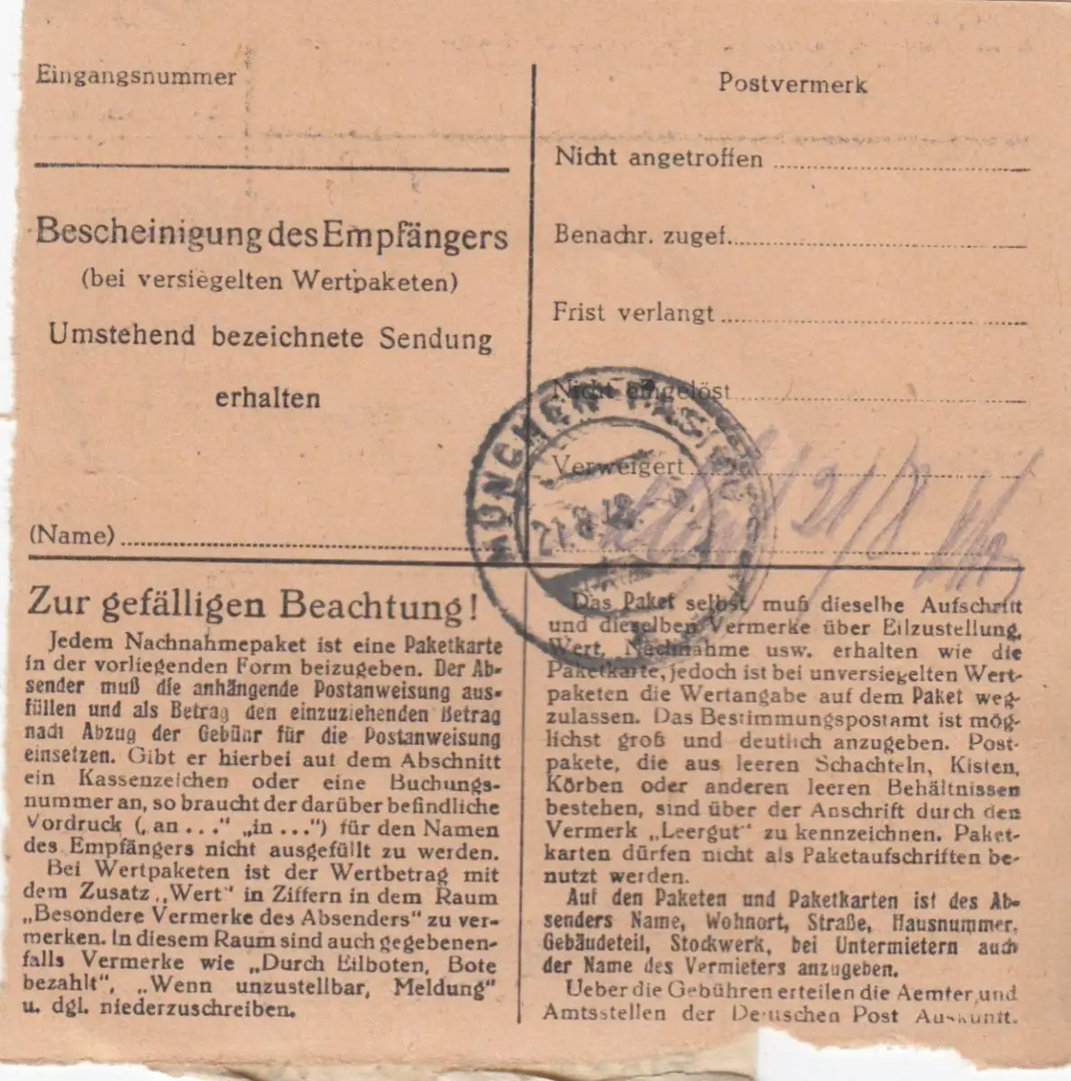 Carte de paquet BiZone 1948: Rosbach Neumarkt après Gräfelfing, remboursement, frais supplémentaires