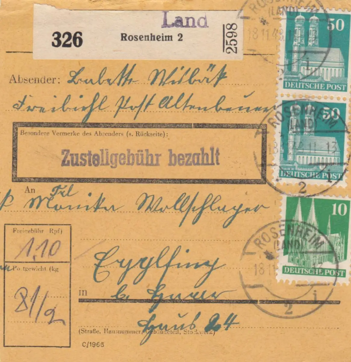 Carte de paquet BiZone 1948: Rosenheim Altenbrunn après Eglfing