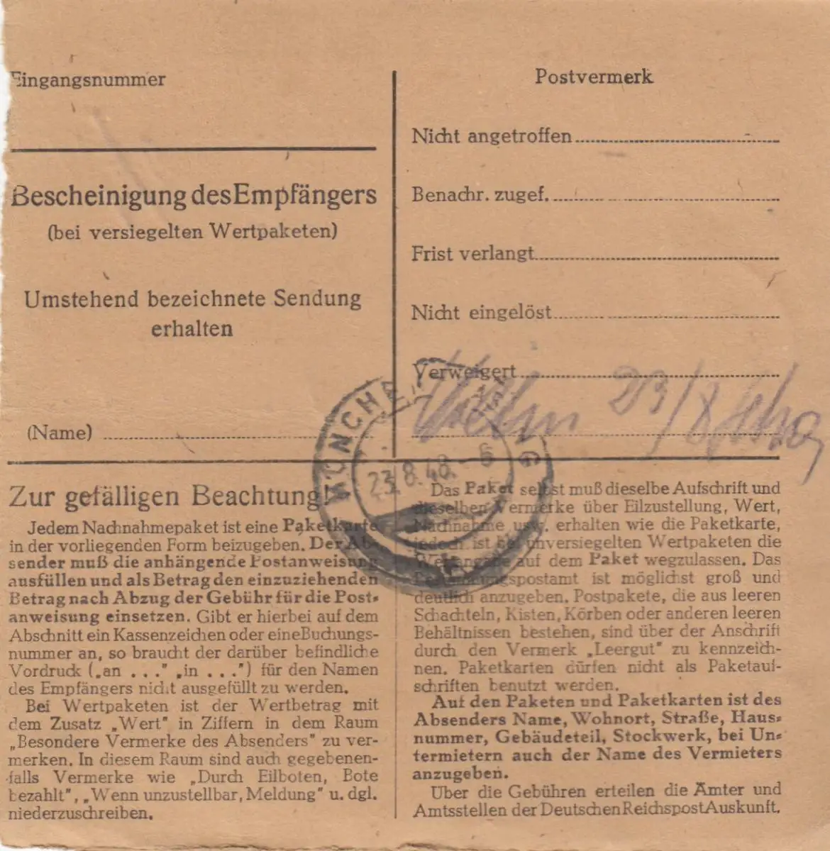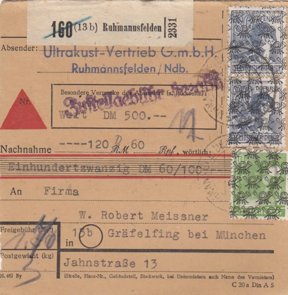 Carte de paquet BiZone 1948: Ruhmannsfelden après Gräfeling, carte de valeur, remboursement