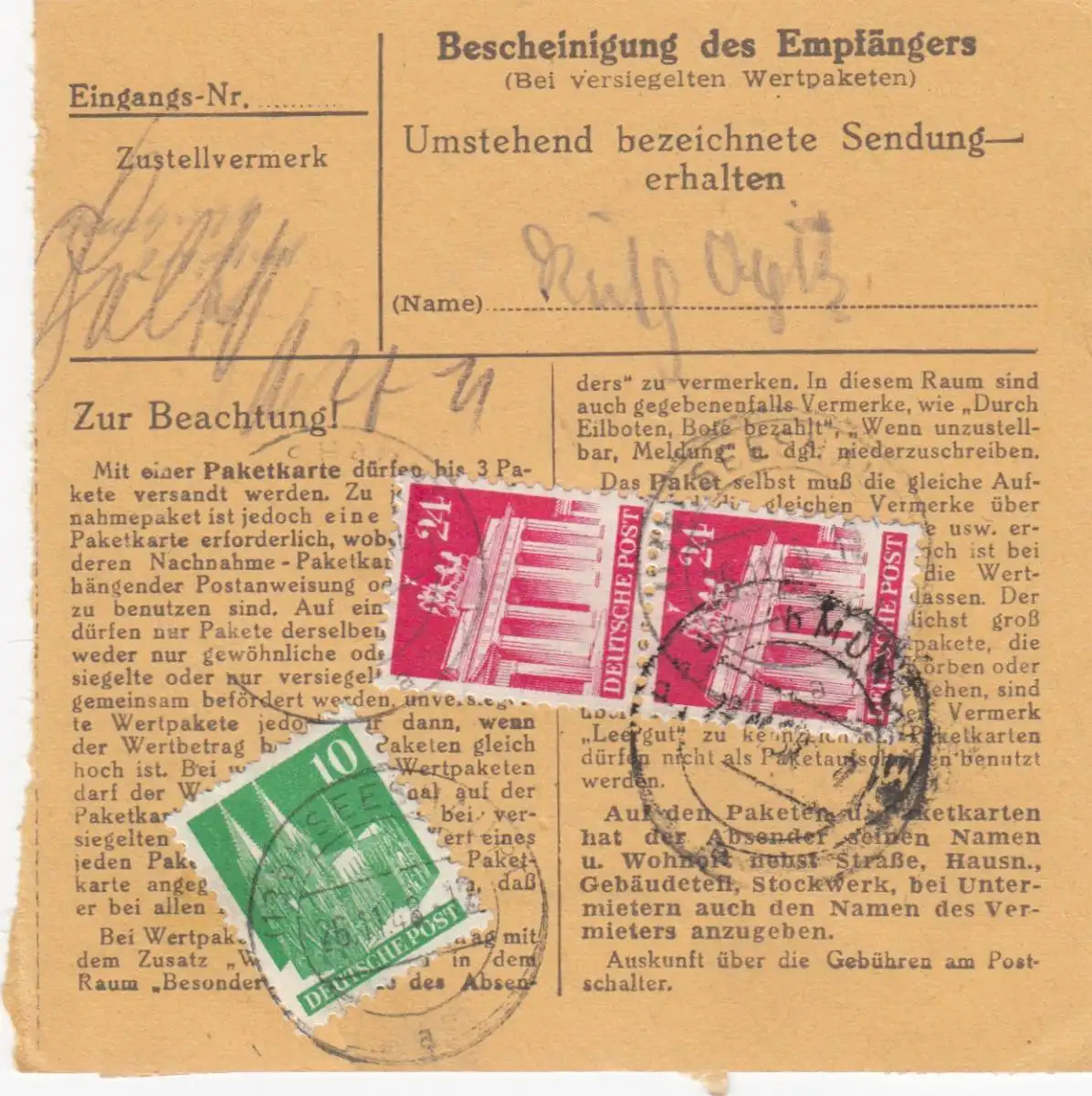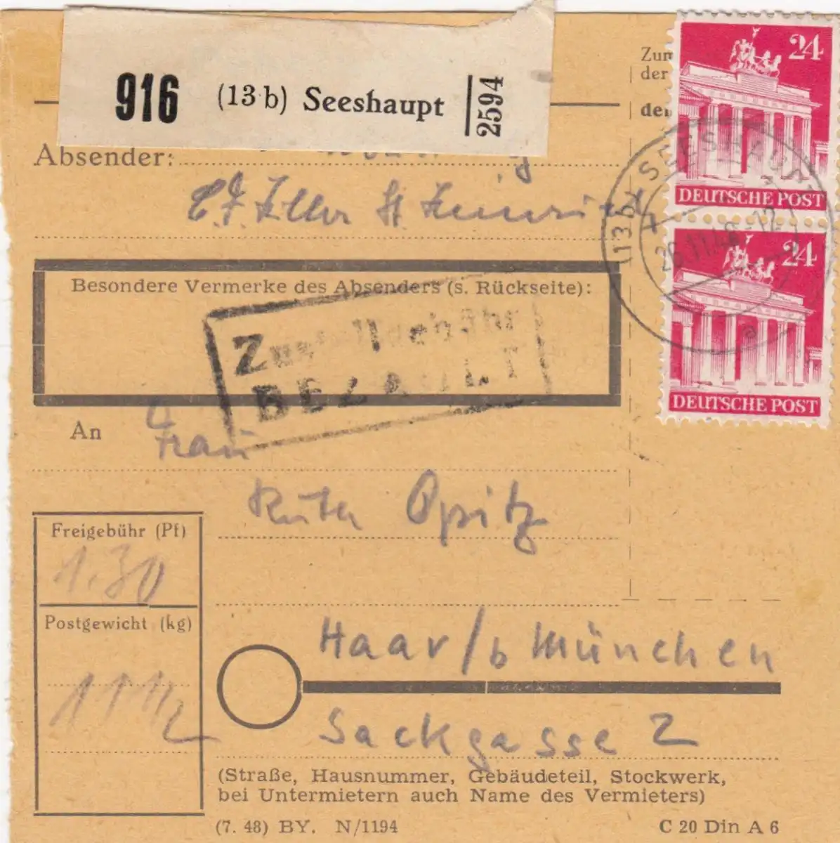 Carte de paquet BiZone 1948: Seeshaft selon Haar b. Munich