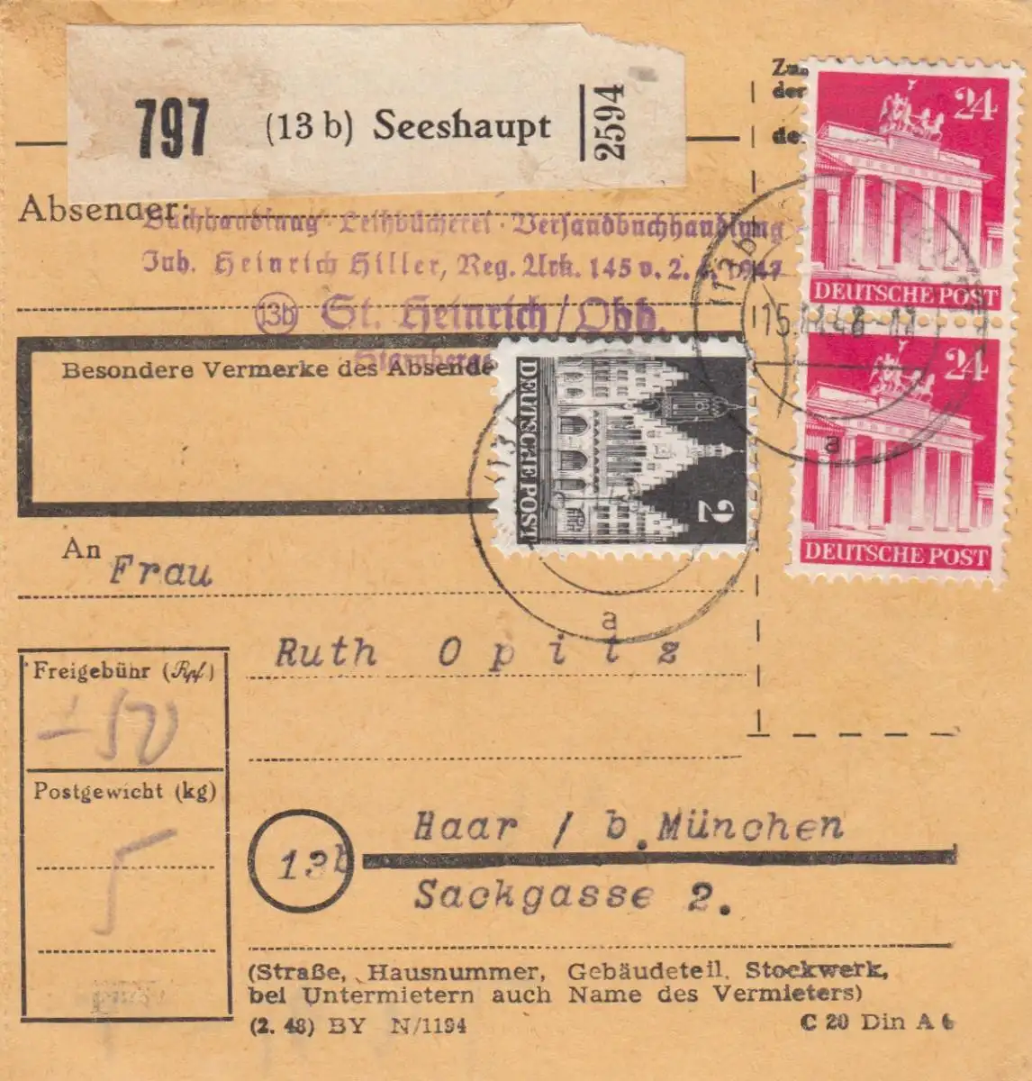 Carte de paquet BiZone 1948: Seeshaft a Haar bei Munich