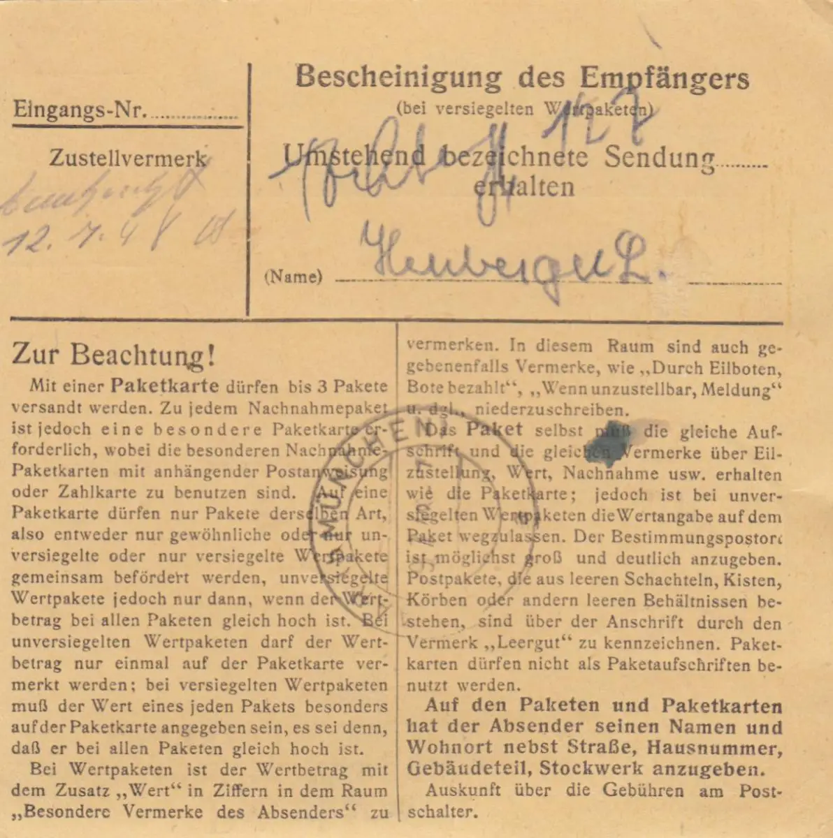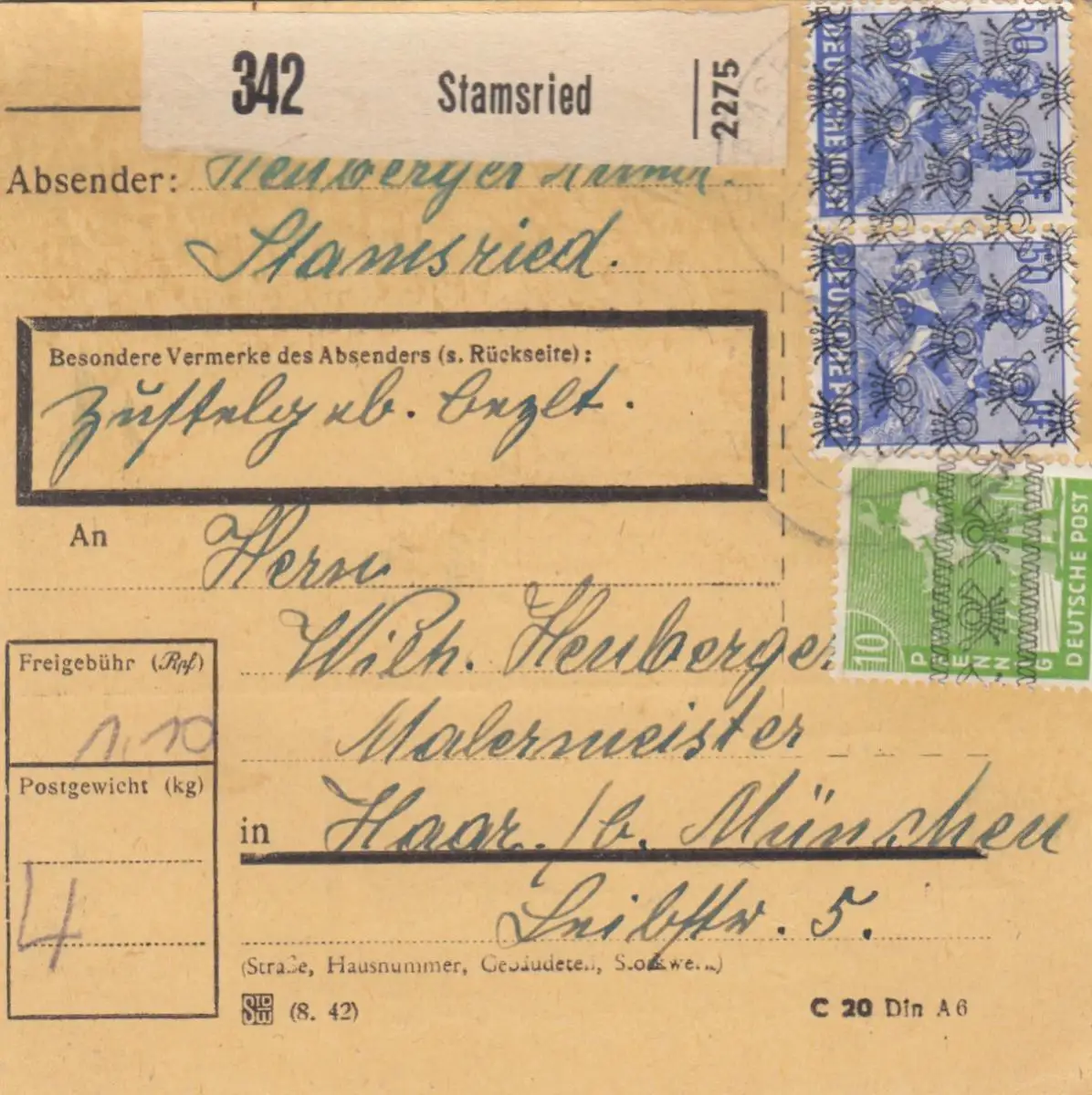 Carte de paquet BiZone 1948: Stamsried selon les cheveux, maître peintre