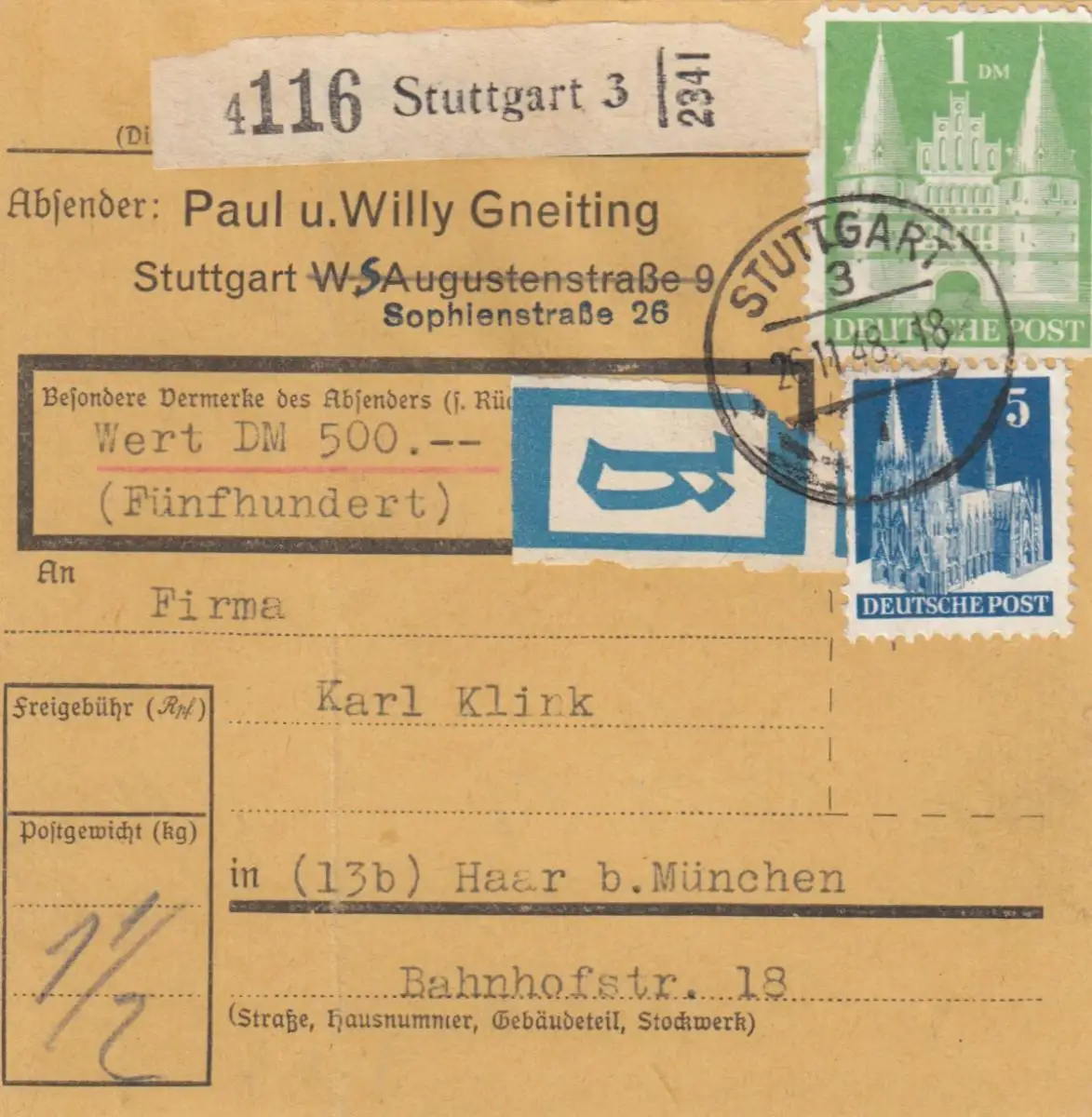 Carte de paquet BiZone 1948: Stuttgart, Auto-bookeur, Carte, autocollant B