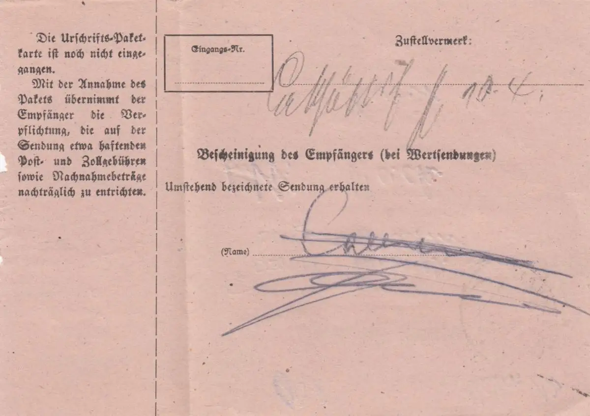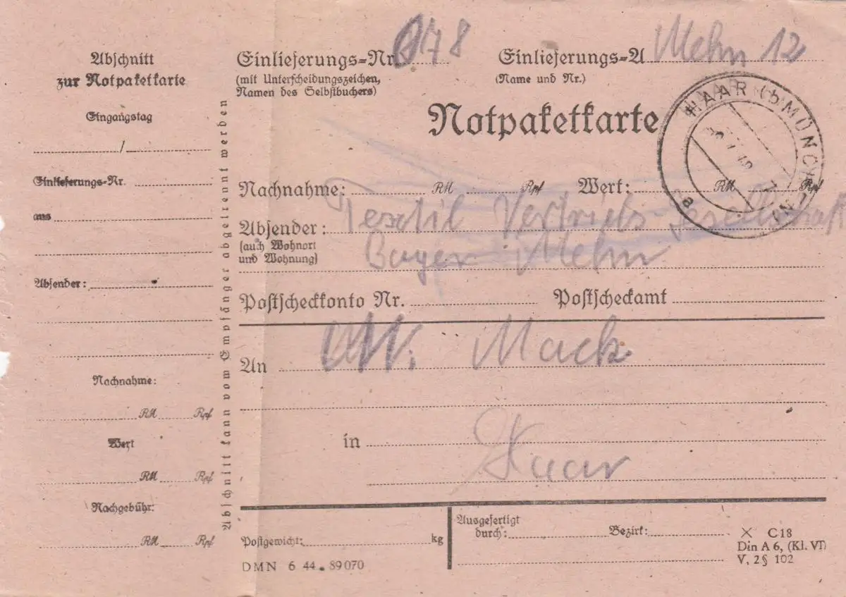 Carte de paquet BiZone 1948: distribution textile, cheveux, carte de colis d'urgence
