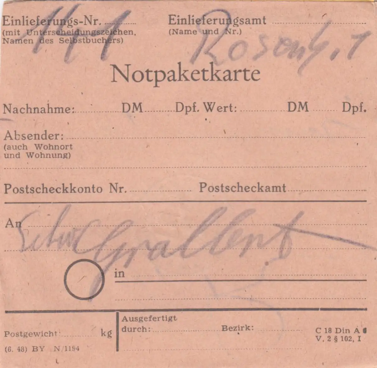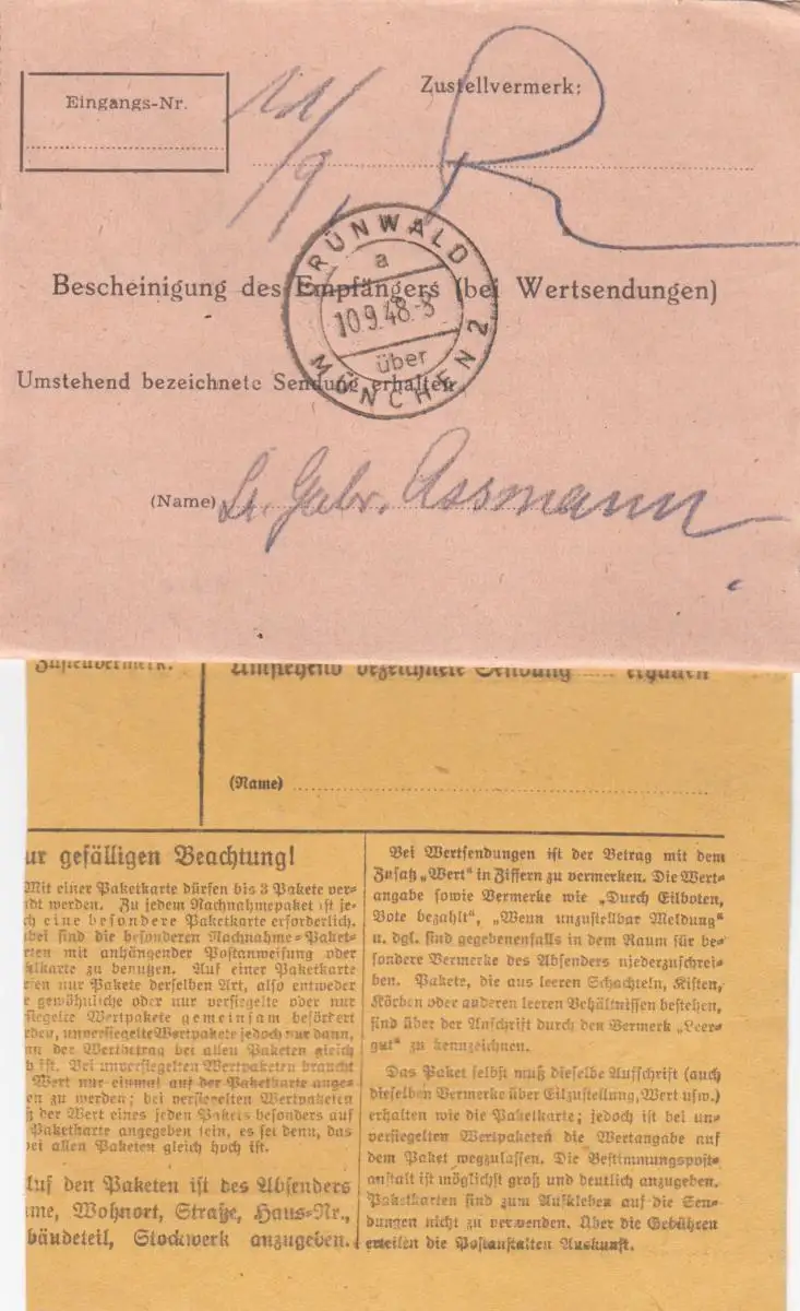 Carte de paquet BiZone 1948: Thalkirchen vers Grünwald, avec carte de colis d'urgence