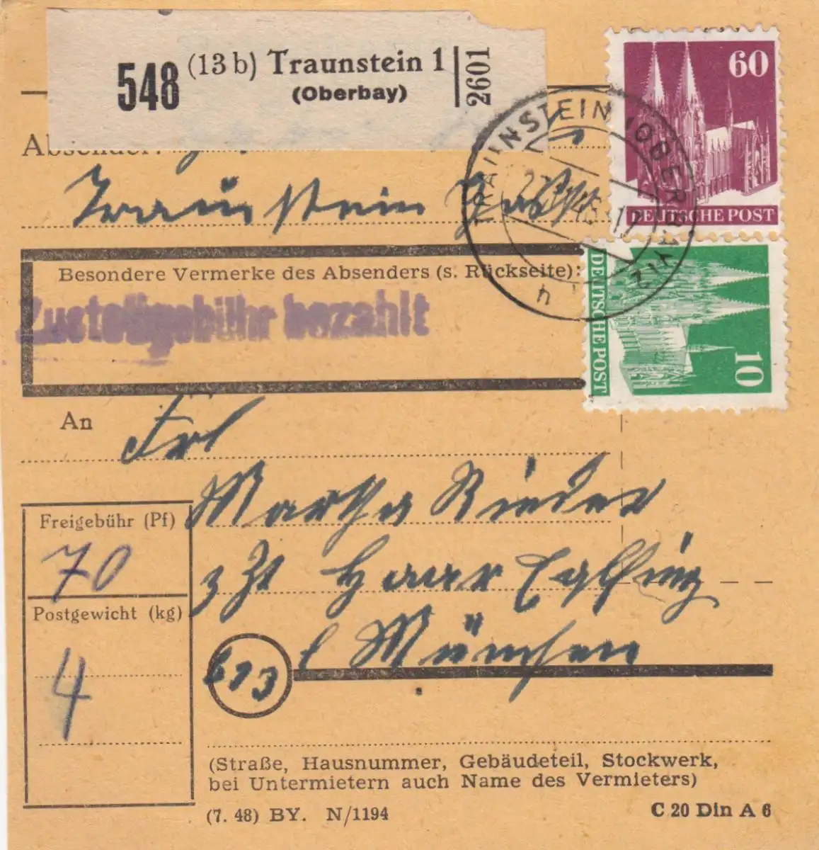 Carte de paquet BiZone 1948: Traunstein (Hauptbay.) selon Haar Eglfing