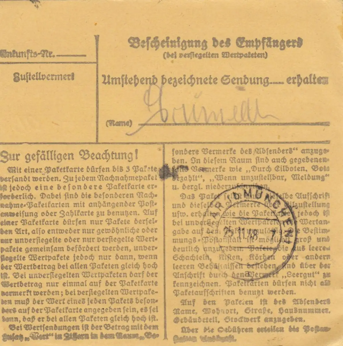 Carte de paquet BiZone 1948: Walheim vers Eglfing b. Munich