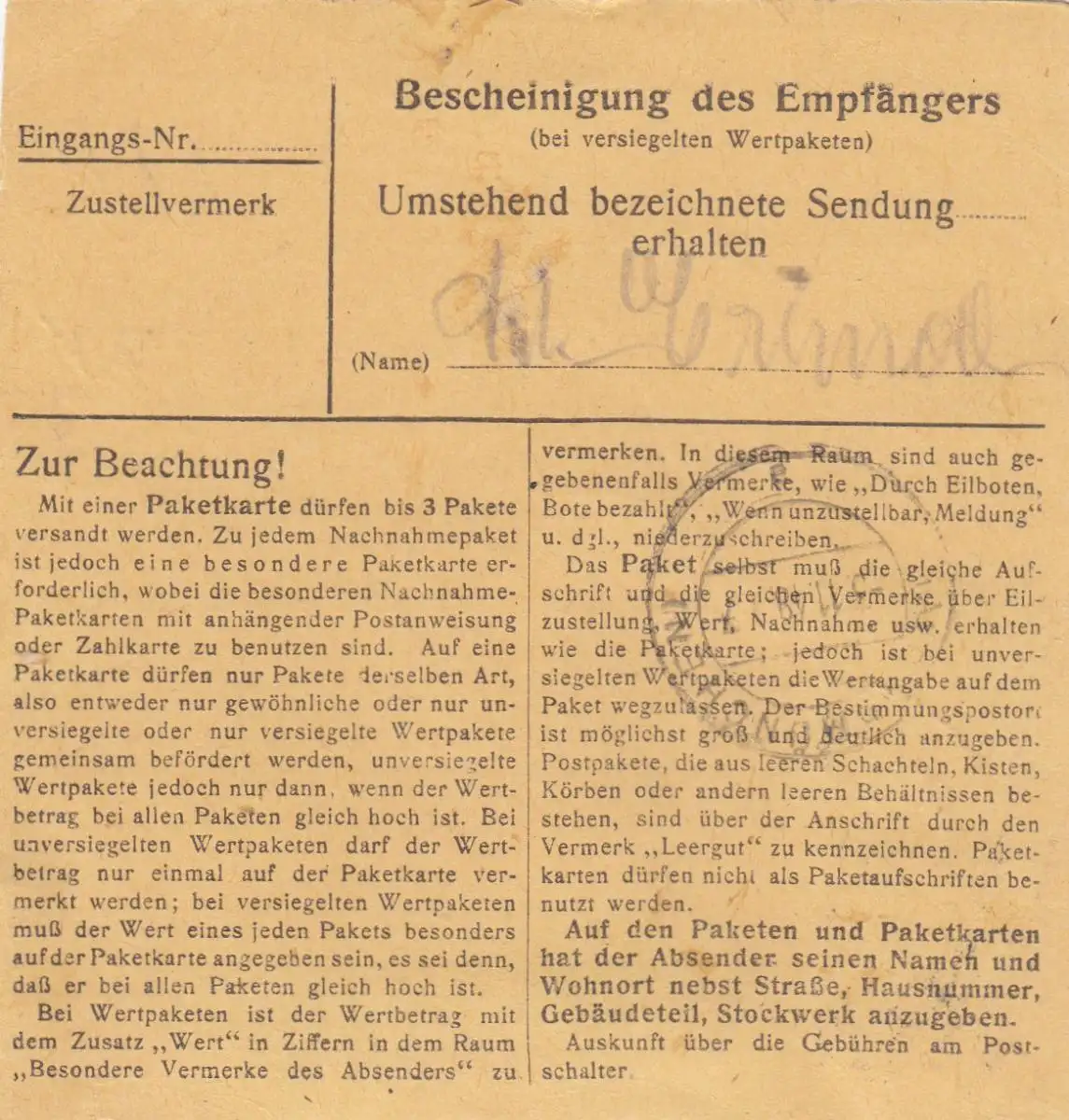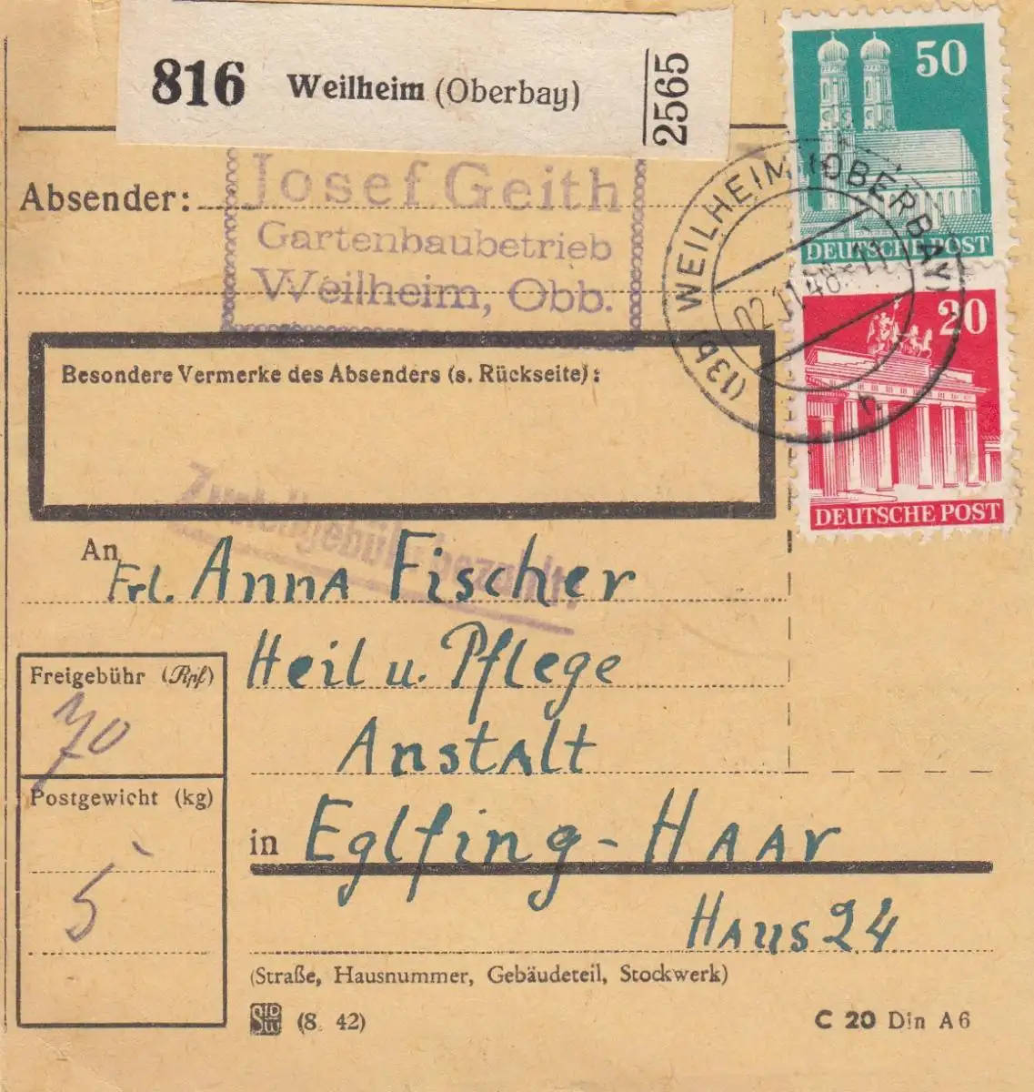 Carte de paquet BiZone 1948: Weilheim (Oberbay) après Eglfing-Haar, établissement de soins