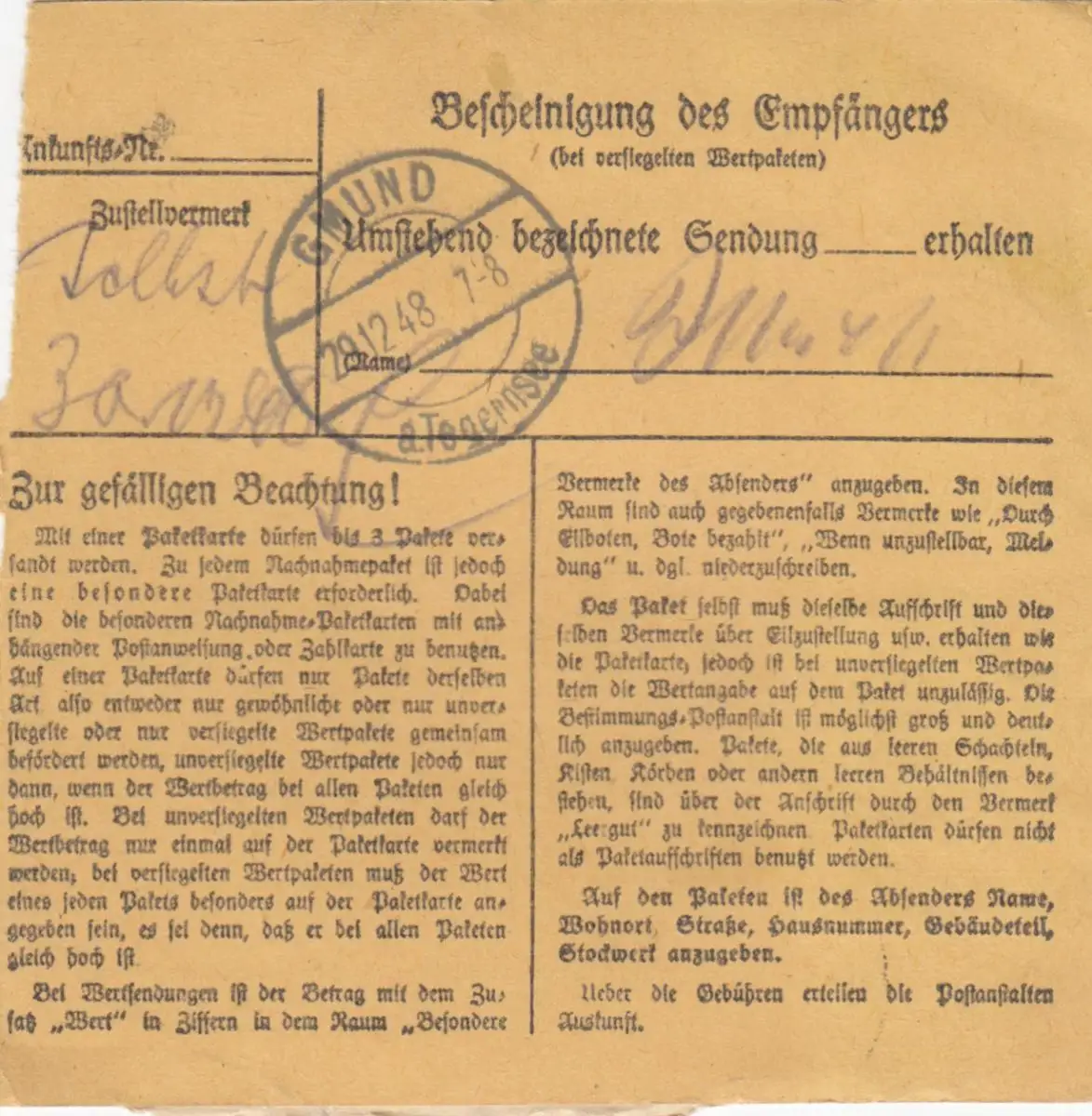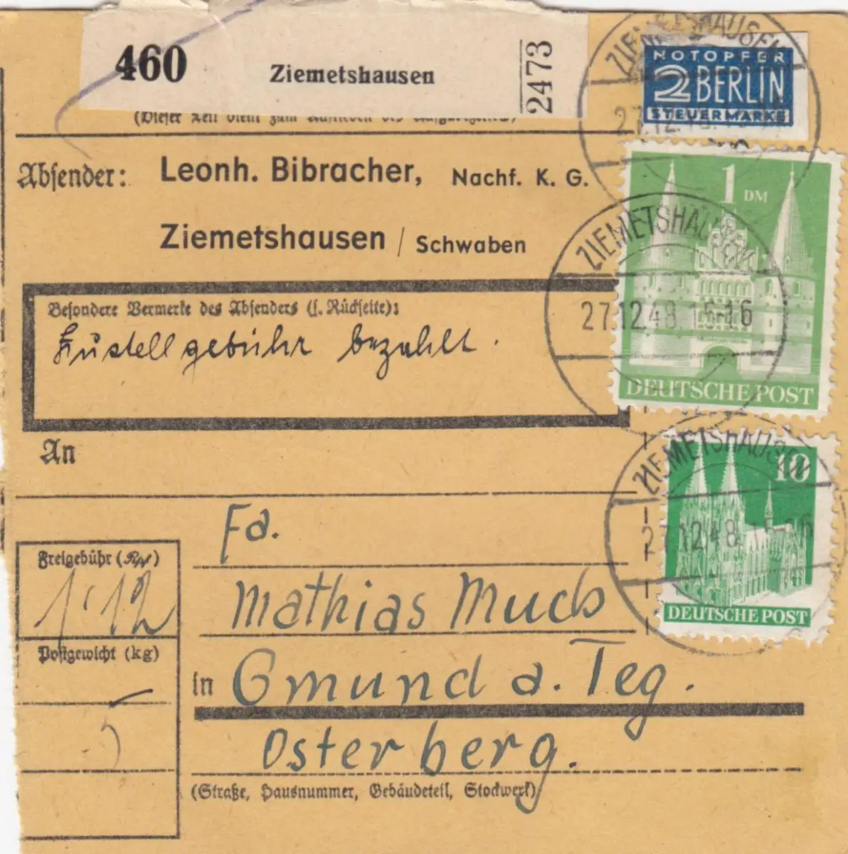 Carte de paquet BiZone 1948: Ziemetshausen à Gmund, Auto-réservation, Victimes d'urgence
