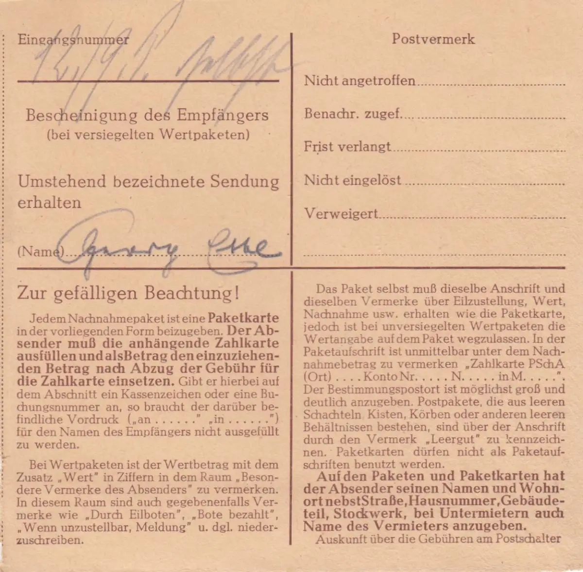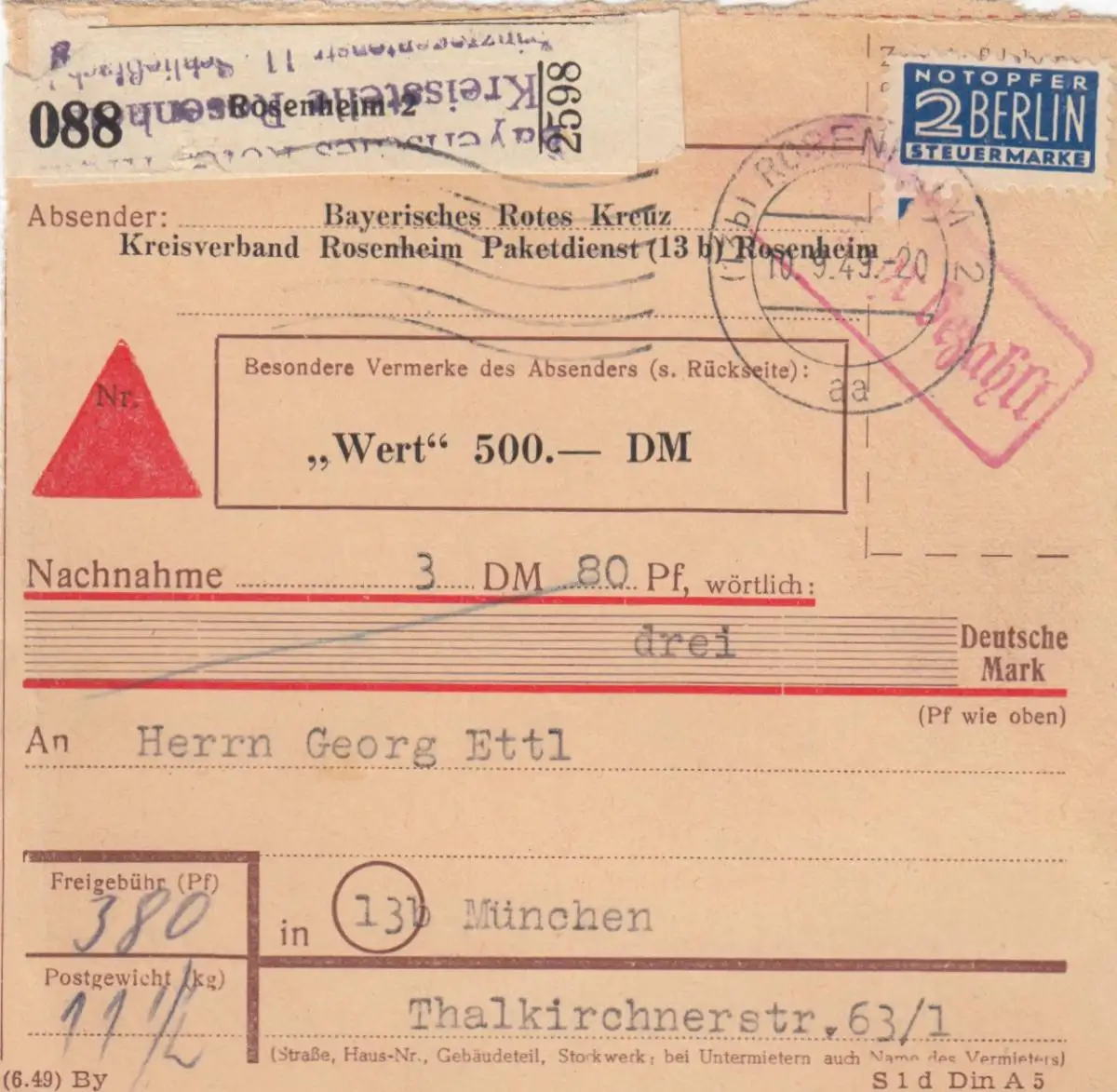 Carte de paquet BiZone 1949: Rosenheim n. Mun., Autob. , Nachn .