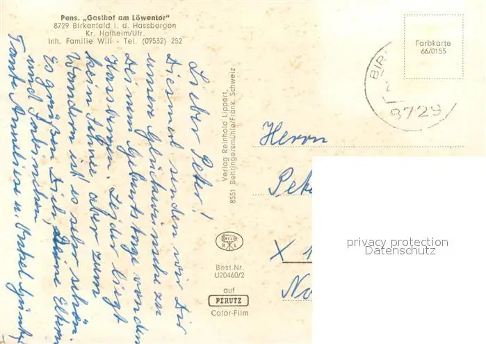 Birkenfeld_Hassberge Blick zur Kirche Pension Gasthof am Loewentor Panorama Birkenfeld Hassberge postalisch gelaufen nach 1965 Erhaltung siehe scans [FriedD77] Frierer