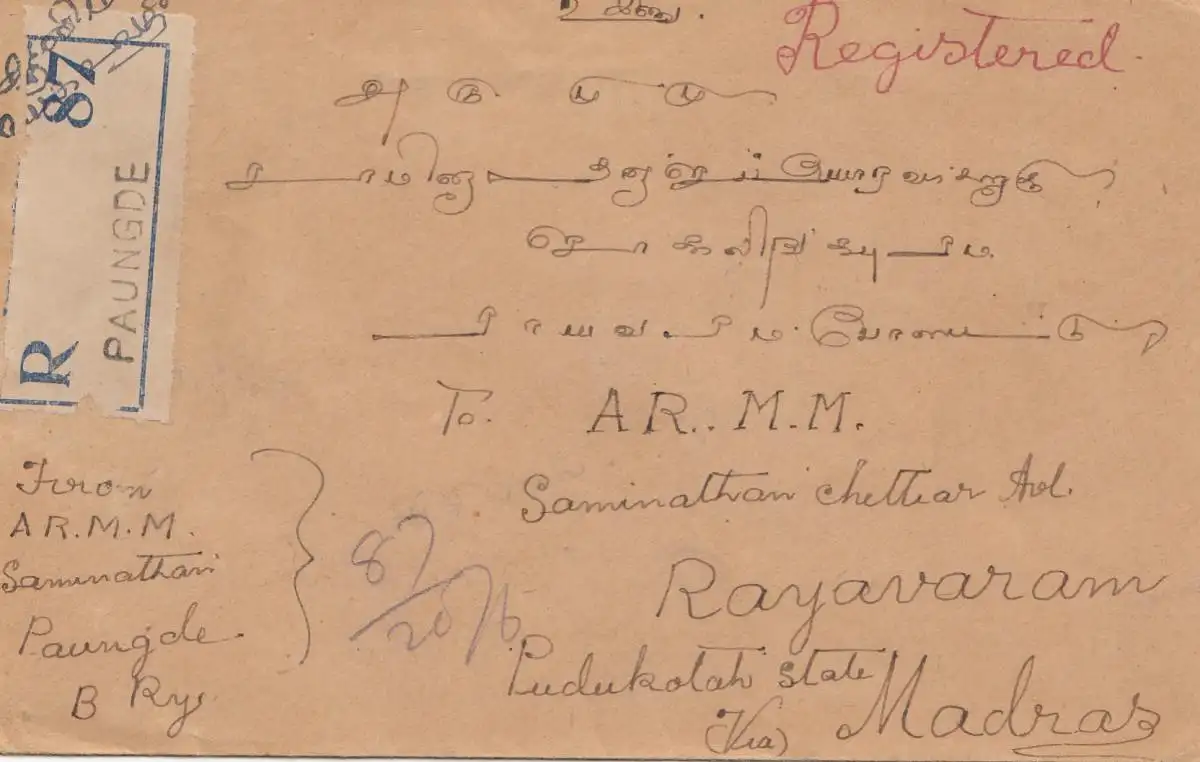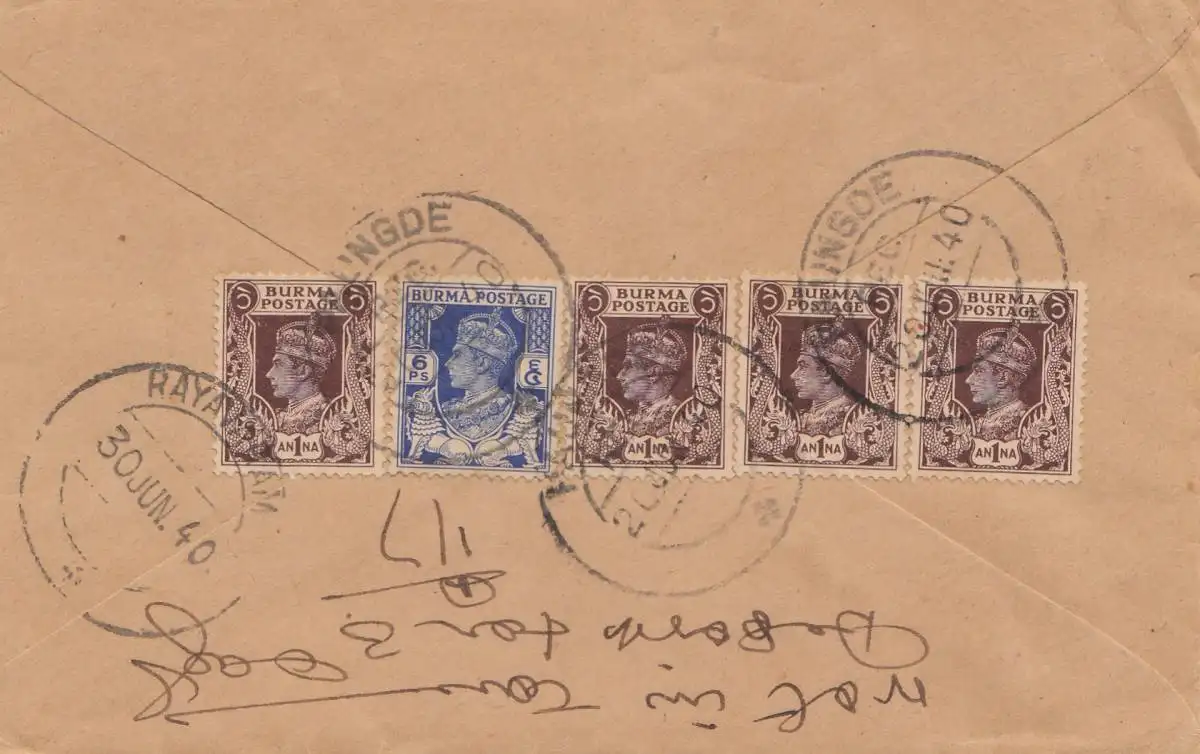 Birmanie: 1940: registered letter Paungde to Rayavaram