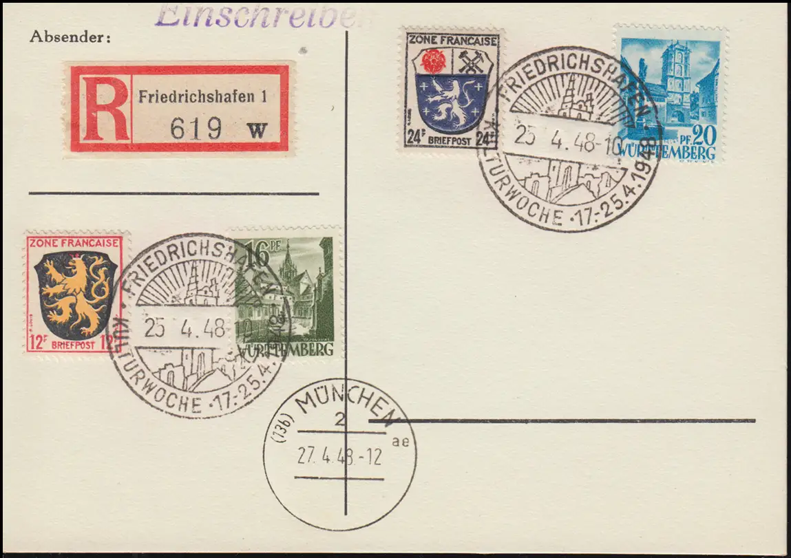 Blanko-R-PK avec SSt FRIEDRICHSHAFEN Semaine culturelle 25.4.48 + MUNICH 2 ae 27.4.1949