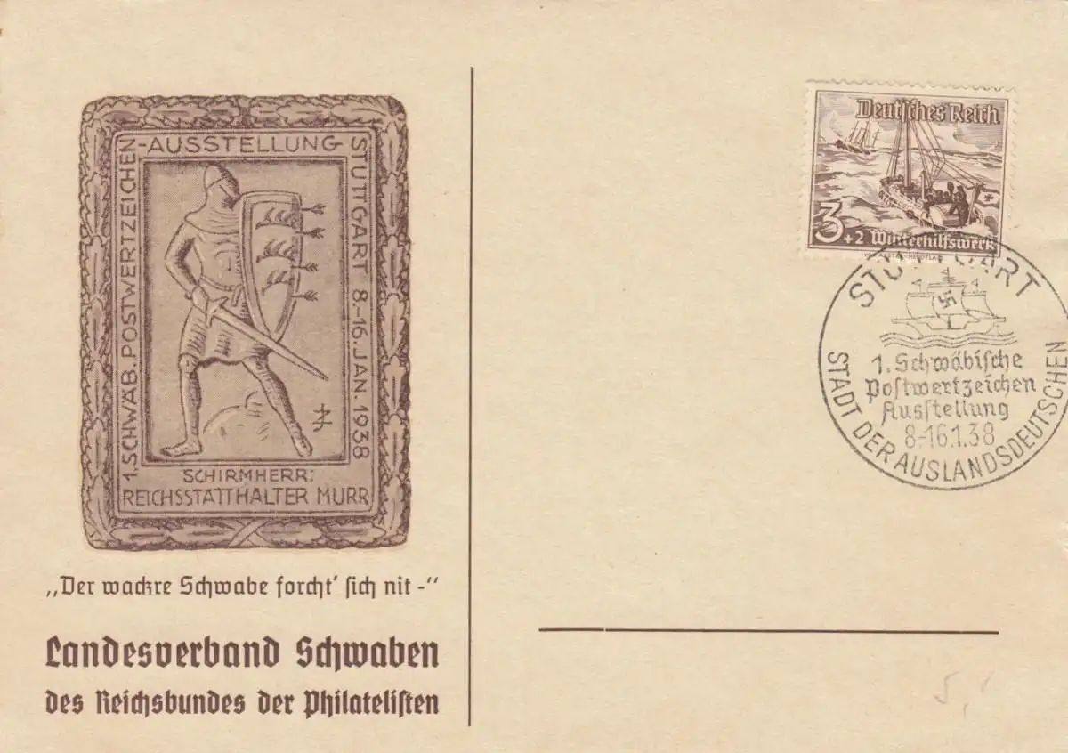 Blanko Certificat spécial de timbre 1938: Stuttgart: Landesverband Schwaben Philatelisten