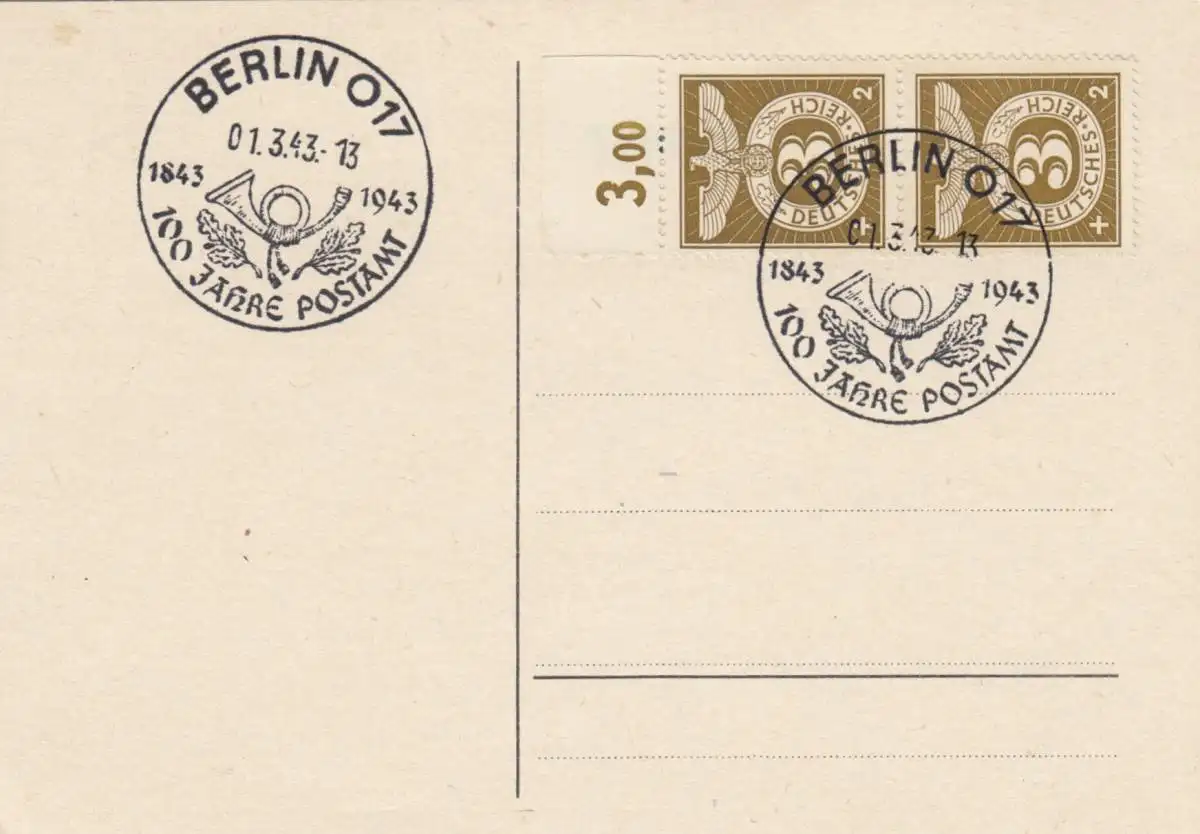 Blanko Certificat spécial de timbre 1943: Berlin: 100 ans Bureau de poste
