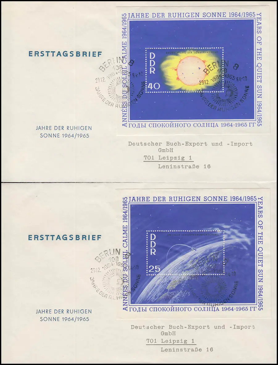 Bloc 20+21+22, année du soleil calme 1964, sur 3 FDC, livre-export Leipzig ESSt