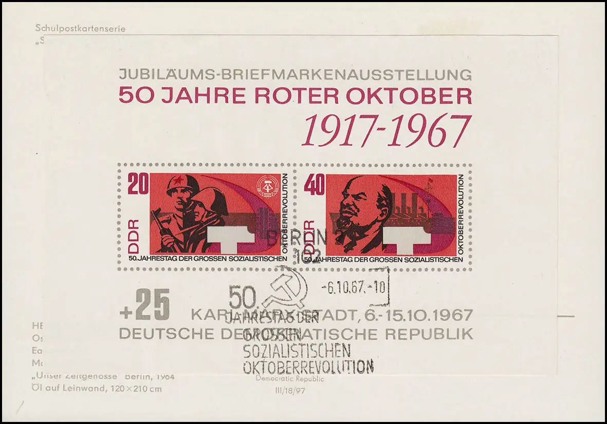 Bloc 26 Révolution octobre avec ESSt BERLIN 6.10.67 sur carte postale scolaire peintures