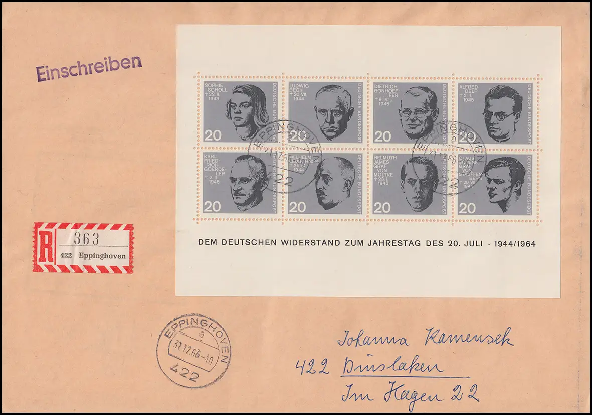 Bloc 3 Assassinat 20 juillet 1944 sur lettre R EPPINGHOVEN 31.12.66 à Dinslaken