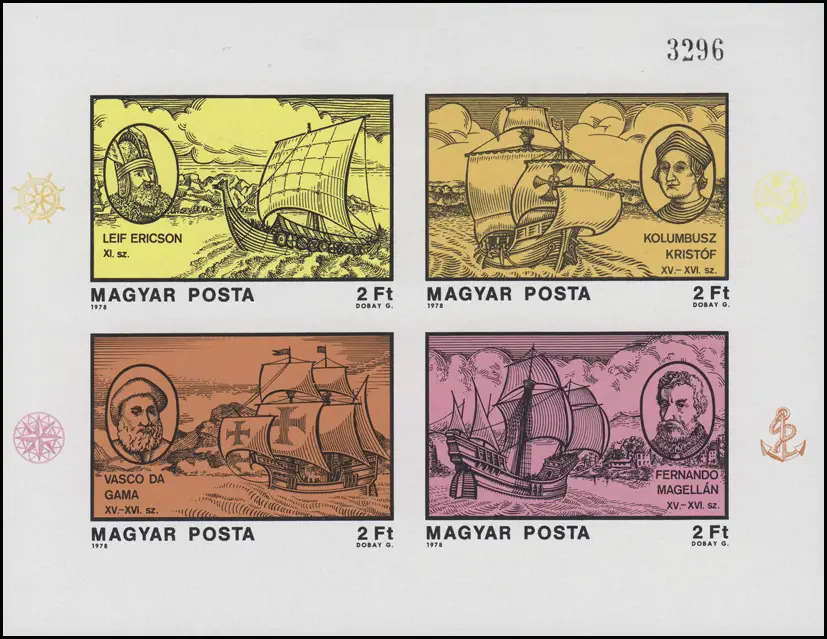 Leif Erikson, Christophe Colomb, Vasco da Gama, Fernando Megallan Numéro de catalogue: 3294-3297Bl.131B Vérification: original Référence produit: 91800329402100>Attention: Cet article est ou était disponible plusieurs fois. L'illustration montre l'un de ces articles en caractères d'exemple. La marque livrée a les caractéristiques indiquées dans la description et peut donc différer de l ' image. Toutefois, en ce qui concerne les marques tachées, nous nous efforçons de fournir l l\'article représenté. Si cela vous convient, veuillez nous le faire savoir.
