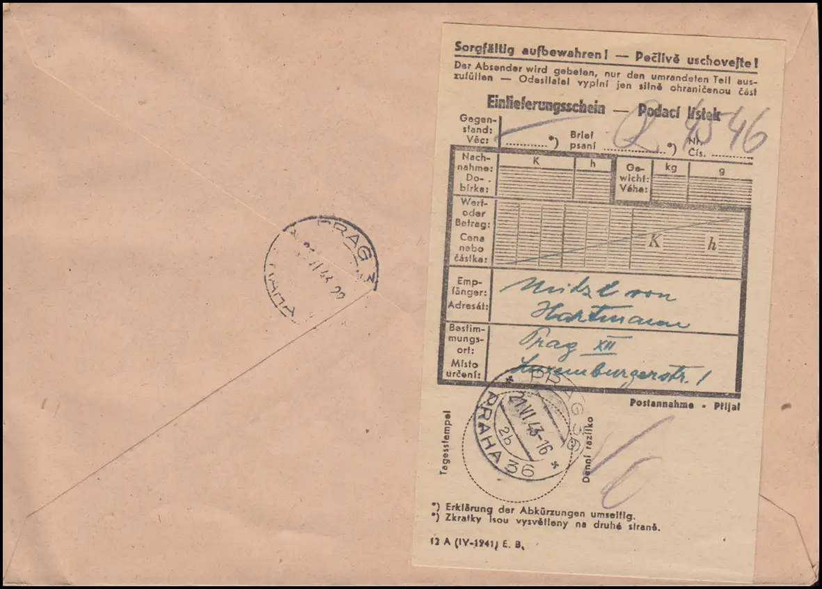Laissez-nous vous donner le bon de livraison PRAG 36 - 21.6.43, faible cachet d'arrivée PRag 31 Numéro de catalogue: 128+114ff Vérification: original Référence produit: 00000000017135