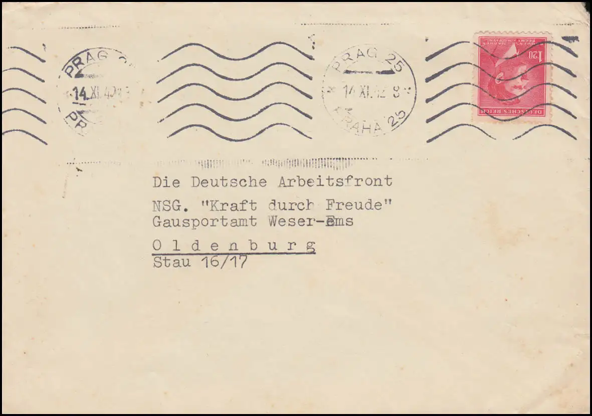 Lettre de l'école de sport allemande Prague III au Front allemand du travail NSG "Kraft PAR FREUDE" Gausportamt Weser-Ems à Oldenburg Examen: original Référence produit: 00000000025576