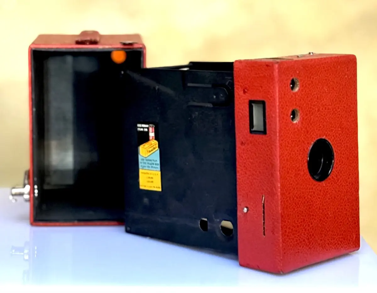Modèle emblématique de la série des boîtiers Kodak, construite à Rochester USA, ce box rouge était conçu pour être très simple d'utilisation : "You press the button, we do the rest".