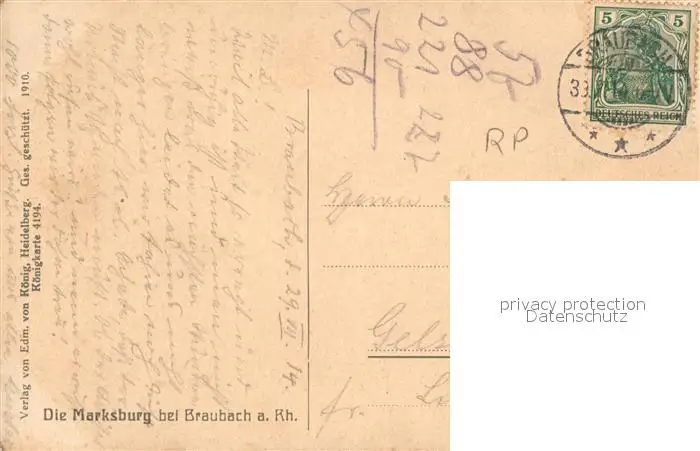 Braubach_Rhein Marksburg Braubach Rhein postalisch gelaufen 1914 Erhaltung siehe scans [FriedD77] Frierer
