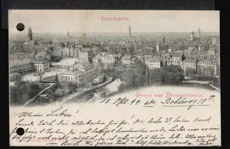 Braunschweig. Gruss aus. Totalansicht - Gelaufen. 1899. 2xLoch. (NPLZ 38100) Posiadamy rowniez konto zlotowkowe w Polsce.